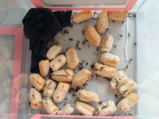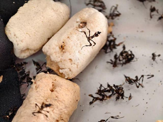 近日,济南邮局海关在对进境邮件进行监管时,发现一票申报为“衣服”的包裹机检图像出现异常。现场关员随即对邮件开拆进行检查,发现纸箱内黑色布料包裹的灰白色卵鞘,共计25个,并已有大量昆虫若虫孵化。经清点,共有活体昆虫341只。经济南海关技术中心鉴定,该批昆虫为外来物种“魔王幽灵螳”。
