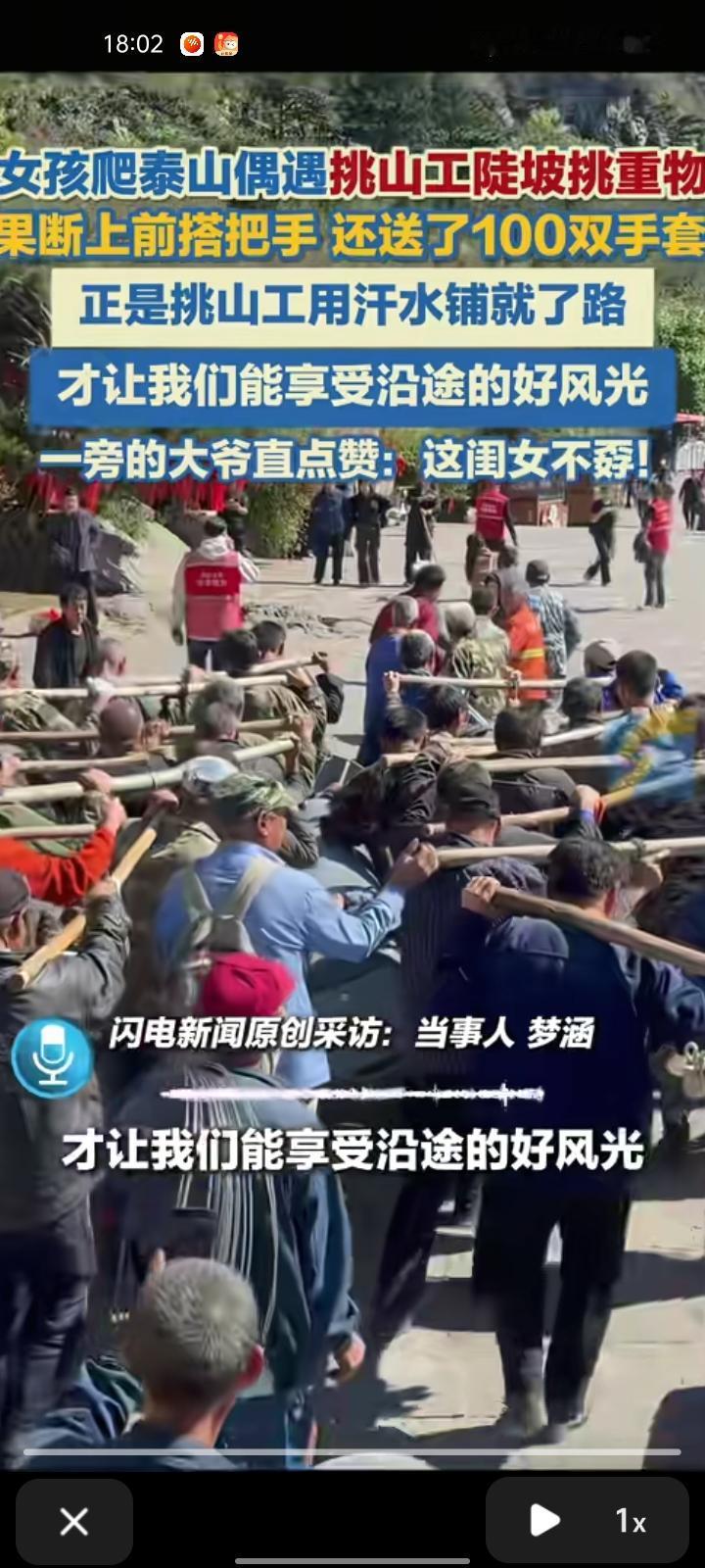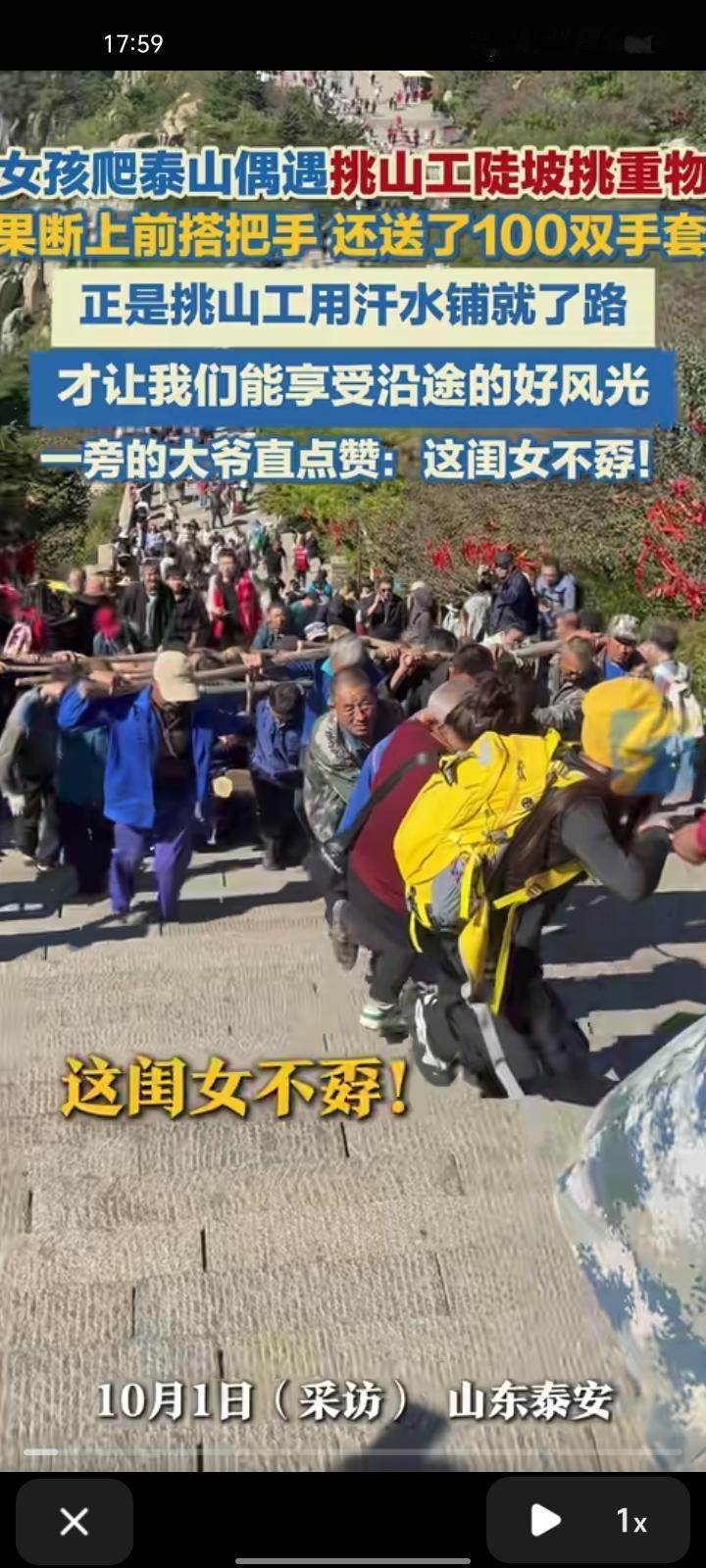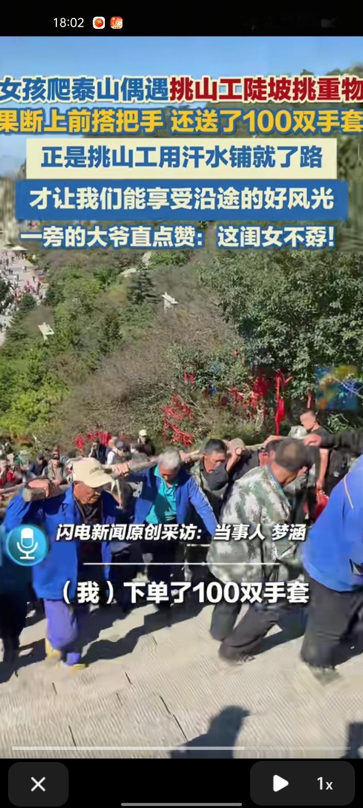 9月26日,山东泰安。女孩爬泰山偶遇挑山工走陡坡挑液压管,看着他们被压弯的身躯,心里不是滋味,果断上前搭把手往上拉。此外,她还还下单100双手套和30条毛巾,一旁大爷直点赞“这闺女不孬”。 当事人梦涵称,正是挑山工们用汗水铺就路程,才让我们享受沿途的好风光。