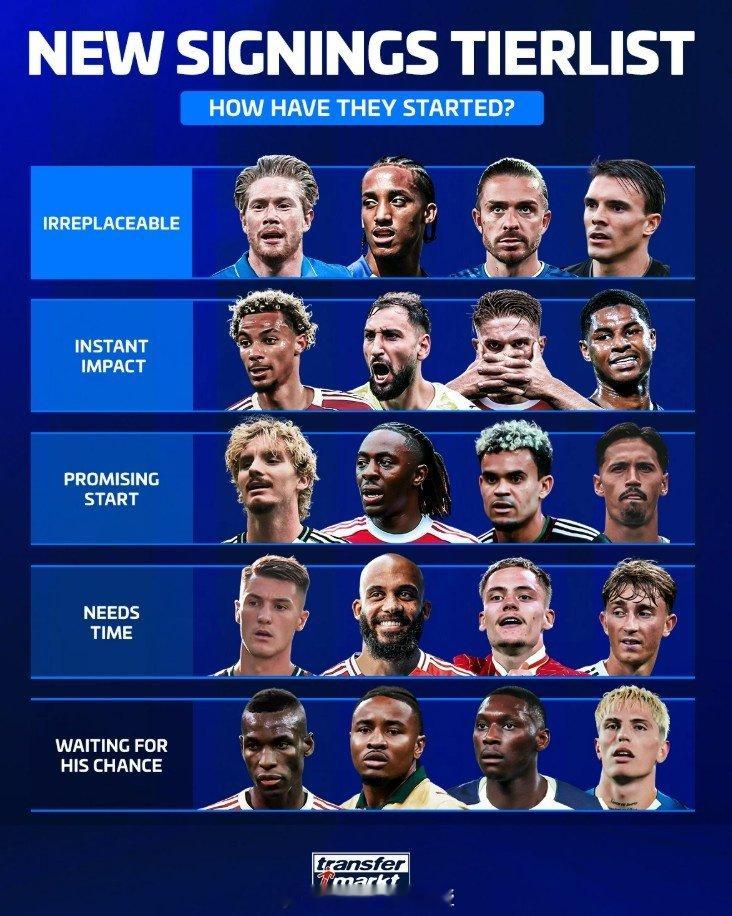 德转为本赛季新援表现做出评级,具体如下:难以置信:德布劳内、若昂-佩德罗、格拉利