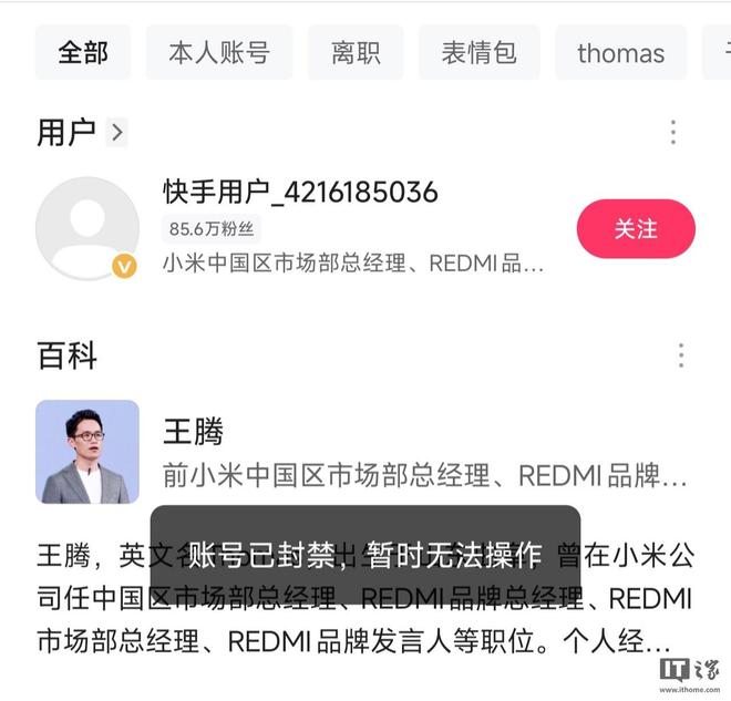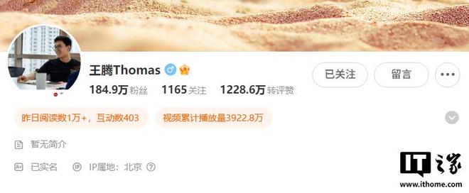 IT之家发现,王腾被小米辞退后,其多个平台的账号出现变动。