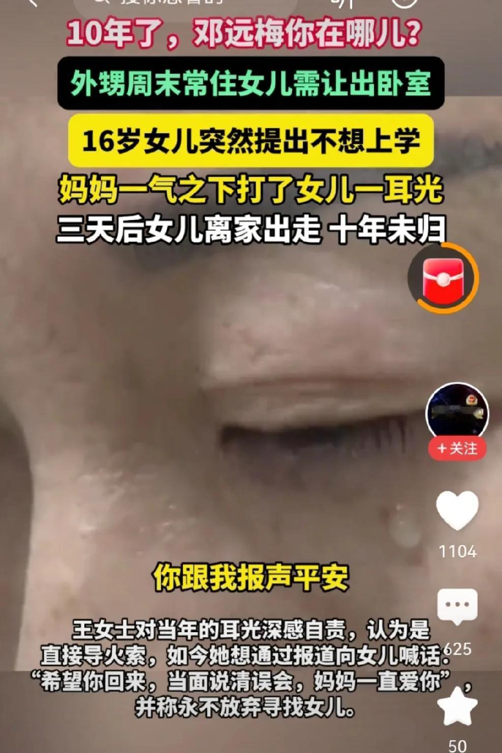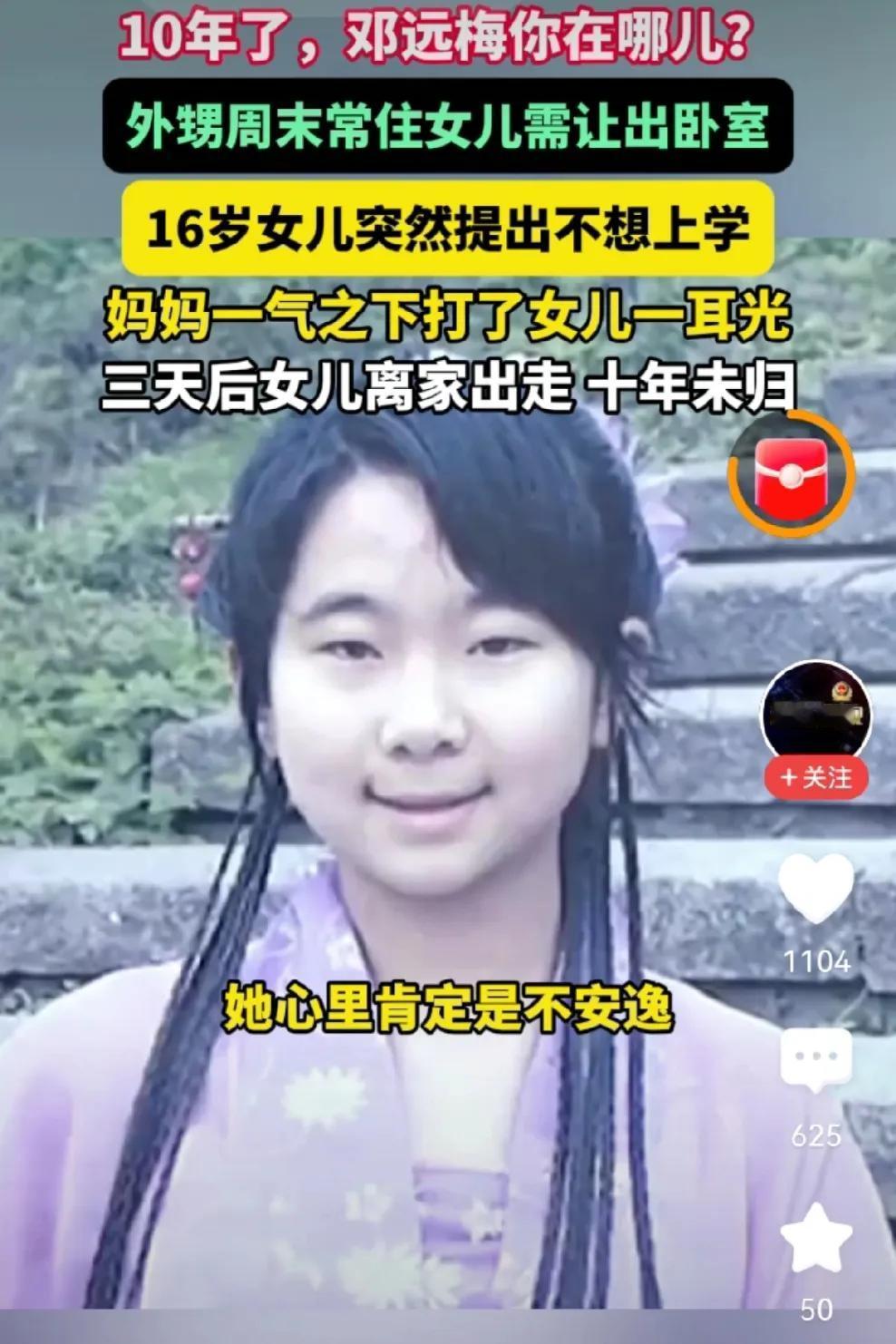 揪心!一位叫邓远梅的女儿因为妈妈的一巴掌,三天后离家出走,10年没回。 近日,一位妈妈流着泪哭诉着自己的懊悔,当年,自己的外甥每个周末需要住进自己家里,她就让女儿让出来给外甥住。 这位妈妈的行为,彻底让女孩失望了。 1.家里过得并不好,房间不多,没有多余的房间让外甥住,就意味着牺牲女儿的利益,让一个女孩搬出来,有可能住客厅,会让女孩非常难为情。 因为女孩已经16了,是大女孩了! 2.女孩跟妈妈表达了自己的不满,妈妈应该好好安慰女孩,想办法消除她的不满,但妈妈没有,女儿提出不上学,她却选择最暴力的方式,打了女儿。 这让女儿彻底失望,觉得自己才是多余的,妈妈的外甥才是更重要的。 3.妈妈不会处理这个事情,她怕女儿离家出走,用藏身份证来阻止,却不想着如何弥补女儿,比如,自己让出来卧室住客厅,让外甥住卧室。 可女儿不想在家里待下去了,藏身份证有什么用呢? 这位妈妈后悔的流下眼泪,希望女儿能回来,她还是非常爱女儿的,不然不会一边打工,一边找女儿。 真的难以想象,一个16岁的花季女孩,在外面能遭遇什么? 这个女孩真的太可怜了,没有身份证,也就意味着无法上学和工作。 如果幸运的话,流离失所,如果遇到坏人的话,真的不敢想! 所以,作为父母,不要为了帮助亲戚,委屈自己最亲近的孩子,有能力就帮,没有能力就要学会拒绝。大家怎么看?