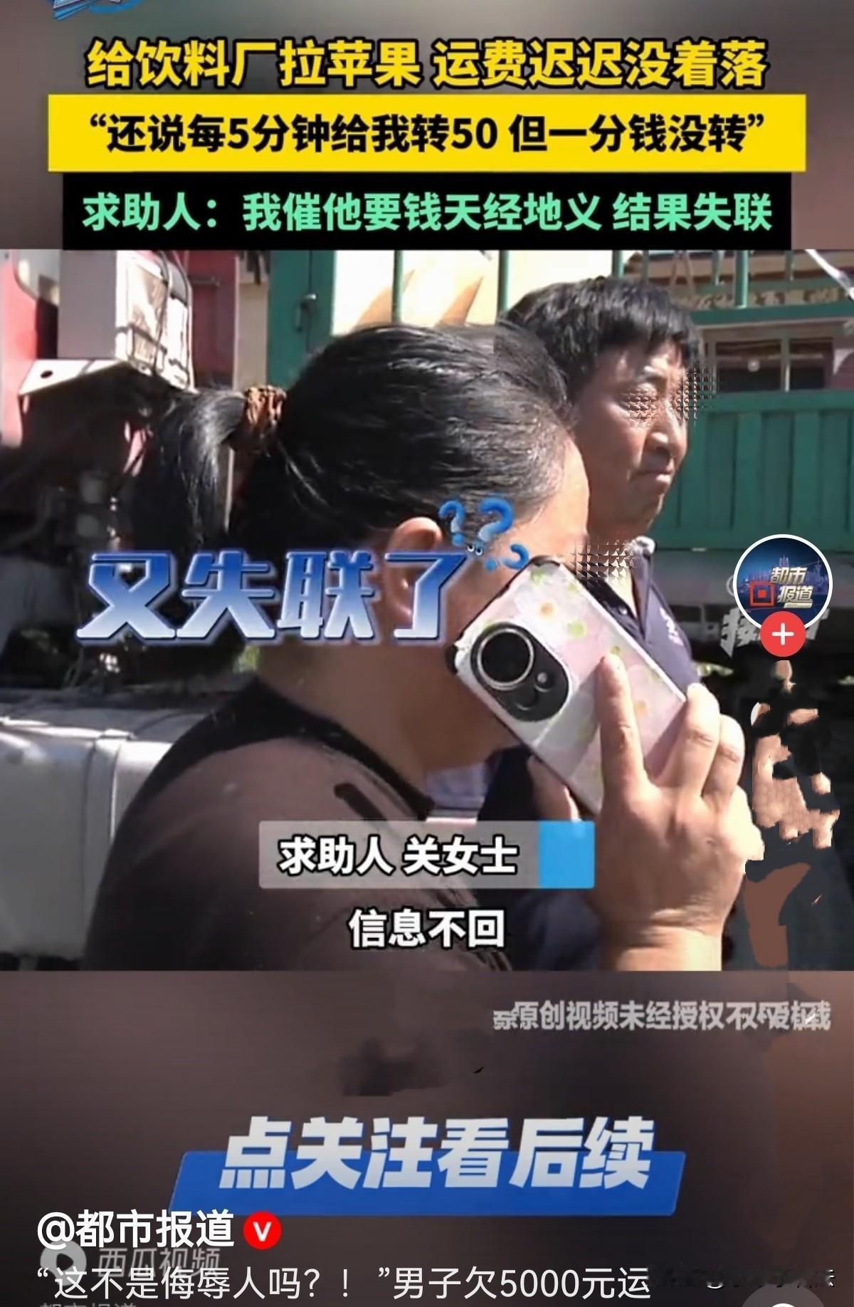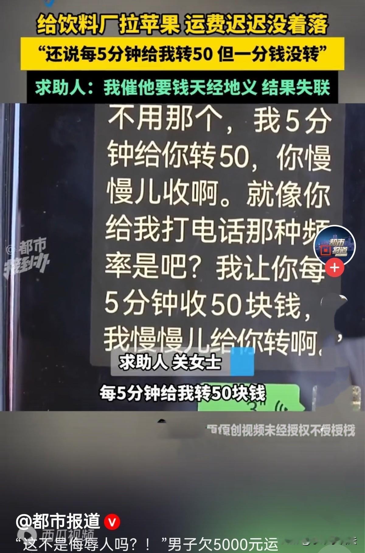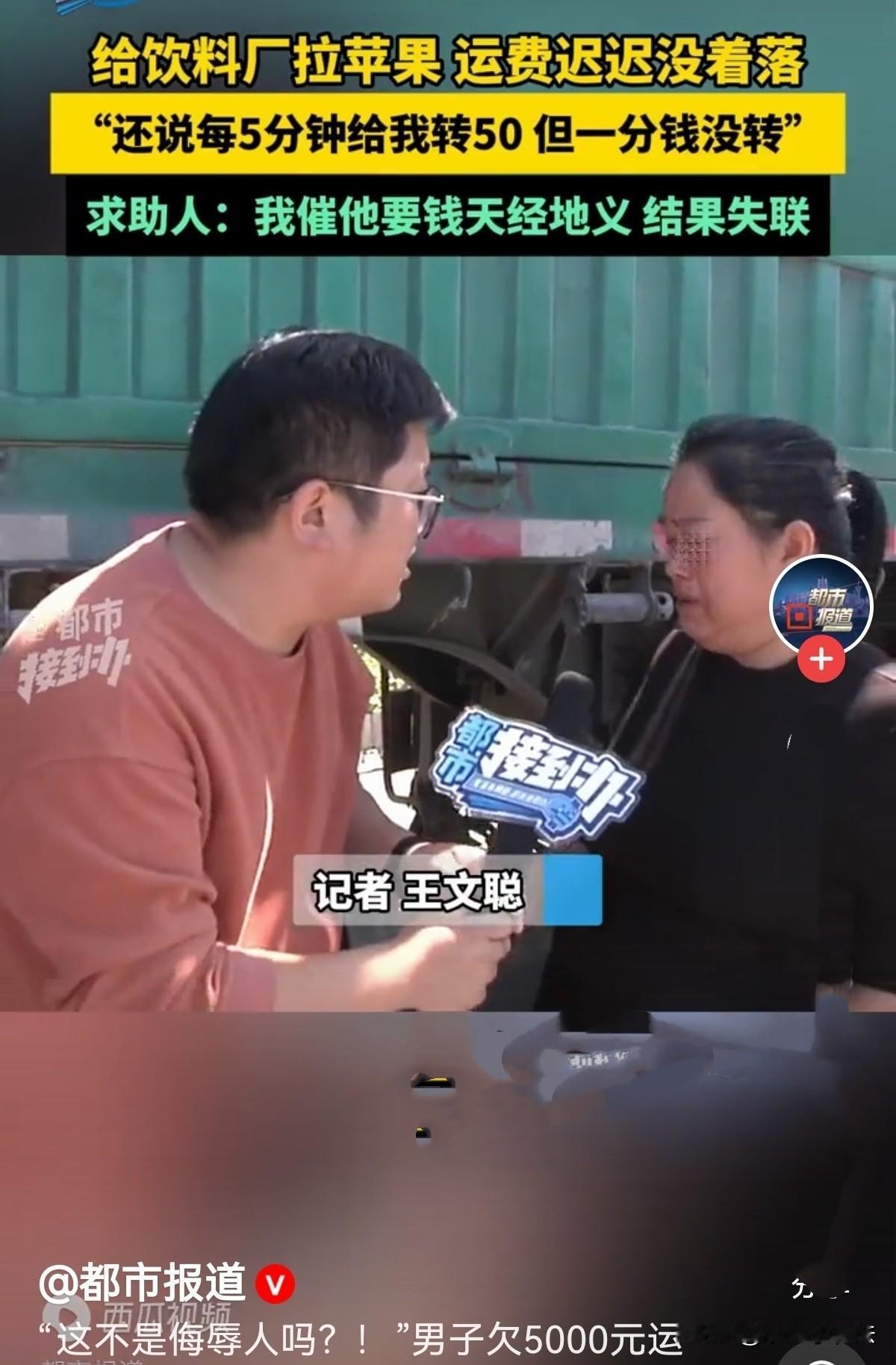 河南安阳,夫妻俩2天2夜不眨眼,千辛万苦把一车苹果从四川凉山运到河南安阳,本想老板说好的货到付款,可他却说第二天再给钱,夫妻俩电话、微信催了很多遍,才在第三天晚上分2次转了3574元,随后老板就恼怒地说剩下的5000元,每5分钟转50,让他们慢慢收。这下可好,两口子一分钱都没收到,老板10多天都联系不上了!夫妻俩不知所措找记者帮忙,结果老板的话更让人生气!这是故意恶心人侮辱人呢? 关女士与冯先生多年前就买了辆大车跑运输,舍下家里老小,整天奔波在路上,风里来雨里去的不分昼夜地奔忙,靠拉货赚运费,辛苦养家! 那日冯先生在平台接了一单,从四川凉山往河南安阳一饮料厂运苹果,对方要求到货付款,他没犹豫就答应了,干完活再给钱,也是常事,虽是陌生客户,一般也都很讲诚信! 夫妻俩知道这趟是苦差,一是路途遥远,二是苹果易腐败变质,必须快马加鞭,中途不能耽搁。 夫妻俩一咬牙2天2夜没眨眼,一气呵成就到达了目的地。 他们想着任务完成,就能够顺利拿到运费! 谁知9月10日卸完货,老板却说第二天结账,冯先生挺实诚,觉得第一次打交道,给彼此留个好印象,以后可能还有合作机会。 于是,他直接就答应了。可第二天他打电话要运费款,老板不是说忙就是说在外边,各种托辞。而后打电话就不接了。 到9月12日晚上,终于接电话了,在关女士催促下,老板给她转了3000元,关女士一看,咋就给这点呢?她再次催要,老板又转了574元。 关女士很不理解,还差5000元,为啥不一次性给完呢?她再次催要,老板没好气地回她:从明开始,一个小时给你转50元! 关女士纳闷了:你就一把转过来不就得了?谁知老板突然来了一句:我5分钟转50,你就慢慢收吧! 关女士这个憋气,干了这些年运输了,从来没碰上过这样人、这样老板的,干活给钱,要运费天经地义!用这种方式不是恶心、侮辱人的吗? 真是啥人都有!冯先生也气够呛,但一想5分钟转50元,5000元不到一天也转完了,钱能收回来就得了。 他劝妻子忍忍吧!钱在人家手里,咱就得低三下四的,钱要回来才是正事! 然而,他们没收到一分转账不说,竟连10多天都接不通老板的电话了,这个人失联了! 这下两口子慌了,这趟运输收不回运费可亏大了!舟车劳顿暂且不提,一路的费用加油也是一笔开销,老板咋能这么干呢? 万般无奈,夫妻俩找到记者,希望帮她讨回剩余的运费。 关女士对着记者哭诉,老板嫌她电话催运费款太紧了,就生气了,运货给运费不是天经地义的事吗? 5分钟转50元想耍人玩,他们忍气压气,想着不管是啥方式,给了钱就算了。 可人都找不到,钱收不回来,遇到这样的人也是真没招! 记者随夫妻俩去找收货饮料厂,厂方解释说,他们对接的是中间商,与供货老板不牵连。 并表示收到的苹果有部分坏果,他们正在协商中还未结清货款。但这事与供货老板及运输货款无关。 虽是这样,厂方负责人还是通过中间商帮他们联系了老板。 老板一看事闹大了,赶紧接了电话并说:5分钟转50元,只是跟他们开玩笑呢!他不可能不给运费。 他说只是货款还都没结,手头紧张,想着欠几天再给,他们催的紧,就随口开了个玩笑而已。 记者协商后,他向关女士夫妻道了歉,并归还了剩余运费款。夫妻俩糟心了好些天,终于要回了运费。 《民法典》第577条规定:当事人一方不履行合同义务或者履行合同义务不符合约定的,应当承担继续履行、采取补救措施或者赔偿损失等违约责任。 关女士夫妻与老板之间存在货物运输合同关系,双方约定货到付运费,这是明确的合同条款。 供货商在支付部分运费(3574元)后,剩余5000元以每5分钟转50元,且最终失联拖延支付,属于不履行合同义务的行为。 供货商的行为违反了合同约定,构成违约,应当承担继续履行支付剩余运费的违约责任。 《民法典》第593条规定:当事人一方因第三人的原因造成违约的,应当依法向对方承担违约责任。当事人一方和第三人之间的纠纷,依照法律规定或者按照约定解决。 老板称因饮料厂为未给中间商结账,他也未收到货款,手头周转不开才拖着不给关女士夫妻运费。 但供货商与饮料厂之间的货款纠纷属于其和第三人之间的纠纷,不能成为其对关女士夫妻违约的免责事由。 供货商仍应按照与关女士夫妻的运输合同约定,承担支付剩余运费的违约责任,其与饮料厂的货款问题应另行解决。 《民法典》第579条规定:当事人一方未支付价款、报酬、租金、利息,或者不履行其他金钱债务的,对方可以请求其支付。 老板以每5分钟转50元的不合理承诺后失联,属于拒绝履行支付剩余运费义务的行为。 若供货商仍不履行,关女士夫妻可以通过法律途径,如向法院提起诉讼,要求法院判决供货商支付运费及可能产生的逾期付款利息等。 关女士夫遇到的妻糟心事,您怎么看?