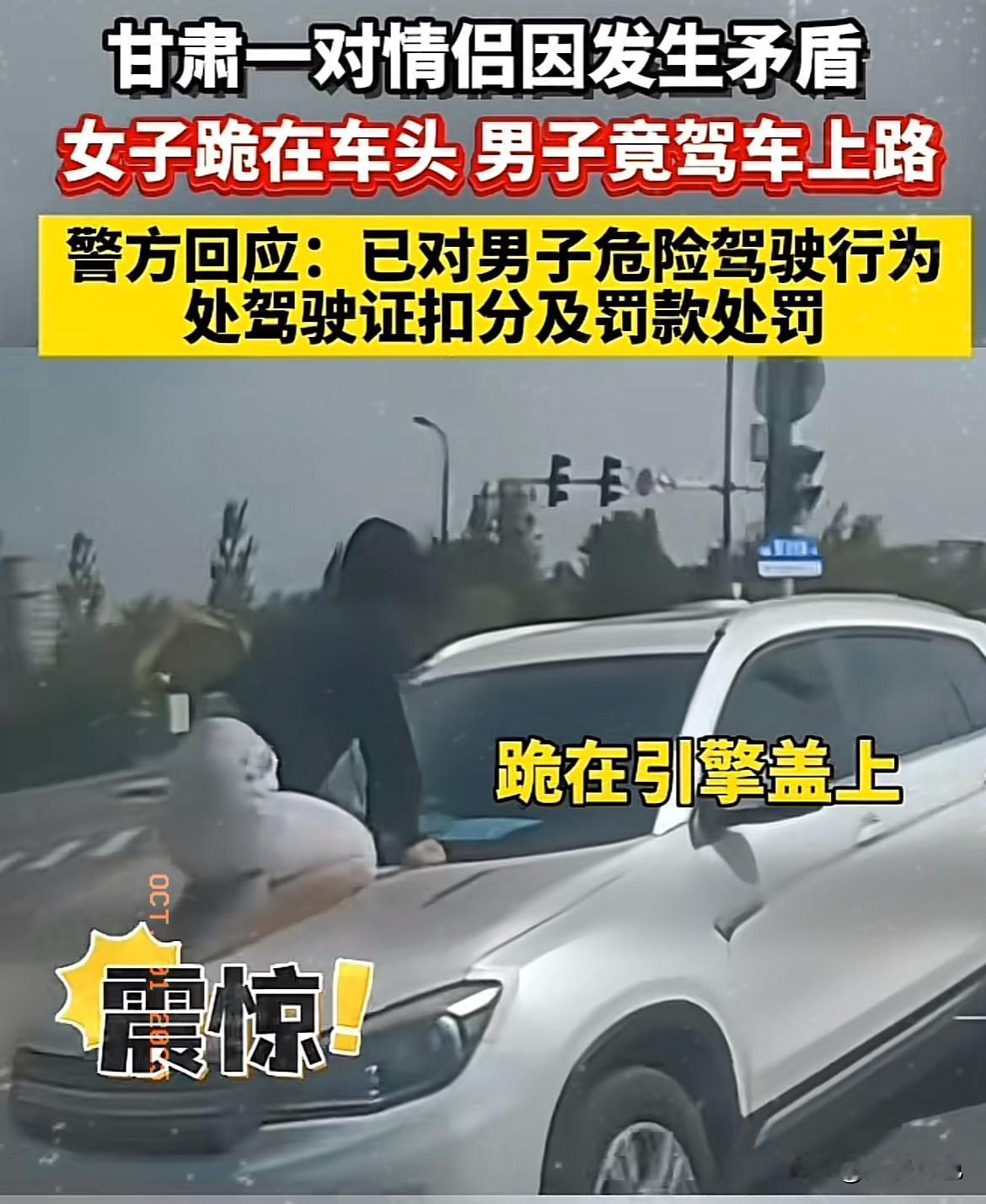 情侣矛盾竟让女子跪车头驾车行驶,这种“恋爱脑”真要不得! 甘肃一对情侣,就因为闹矛盾,女子跪在车头,男子居然直接开车上路,这哪是谈恋爱,分明是拿生命当儿戏! 情侣间有摩擦很正常,但用这种危险到极致的方式折腾,不仅是对自己生命的漠视,更是把路上其他行人、车辆的安全当空气。且不说万一出点意外后果多严重,这种危险驾驶行为本身就触碰了法律红线。警方对男子的处罚,也是给所有抱着“耍脾气可以没底线”想法的人敲了警钟——感情事再闹,也不能越过安全和法律的边界。 说到底,不管是恋爱还是过日子,遇到问题咱得学着理性解决。靠极端行为发泄,最后只会落得害人害己的下场。