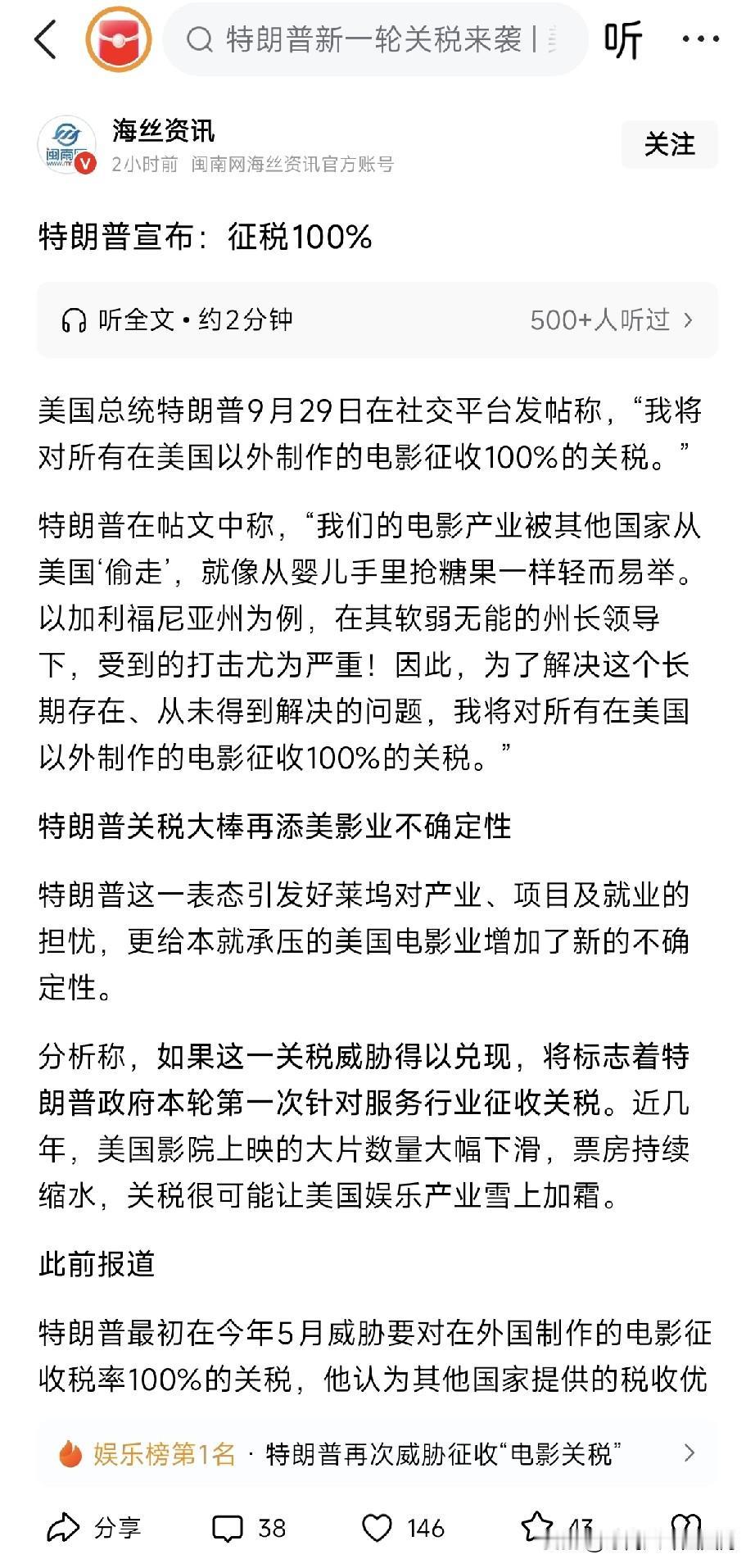 特朗普这次可能失算了。他对着好莱坞挥起的关税大棒,最后打到的可能是美国电影产业的根基。 2025年9月29日,特朗普在社交平台上宣布,要对所有在美国境外制作的电影征收100%的关税。这已经不是他第一次这么说了,今年5月他就发出过类似威胁。他认为美国电影产业正被其他国家像从婴儿手里抢糖果一样偷走,并把矛头指向了加州州长。 但好莱坞的实际情况比特朗普说的要复杂。这些年来,很多大片都是在海外制作的。《碟中谍8》跑遍全球取景,《阿凡达3》在新西兰完成,连最新的《复仇者联盟5》也选择在伦敦拍摄。电影公司这么做很简单,因为海外有更优惠的税收政策和更低的制作成本。 特朗普可能没算清楚一笔账。美国电影协会的数据显示,2023年美国电影出口额达到226亿美元,贸易顺差高达153亿美元。影视业是美国少数几个能保持贸易顺差的领域之一。如果其他国家采取报复性措施,也对美国电影加税,好莱坞在全球市场的收入将受到严重冲击。 有业内人士指出,现代电影制作本身就具有全球性。一部电影可能在多个国家进行拍摄、融资和后期制作。如何界定一部电影是否属于“外国制作”变得非常困难。一位娱乐产业高管认为,这种关税政策不仅影响电影,对电视产业也将造成毁灭性打击。 更现实的问题是,成本增加最终会转嫁给观众。电影票价格可能上涨,而观众数量可能进一步减少。这对于本就面临票房缩水问题的美国电影业来说,无疑是雪上加霜。美国影院上映的大片数量已经在下降,这项政策可能会让情况变得更糟。 特朗普想用关税把电影制作逼回美国,但结果可能适得其反。好莱坞离不开全球市场,这是不争的事实。一旦其他国家开始反击,美国失去的将不只是几个海外取景地,而是整个文化产业的影响力。