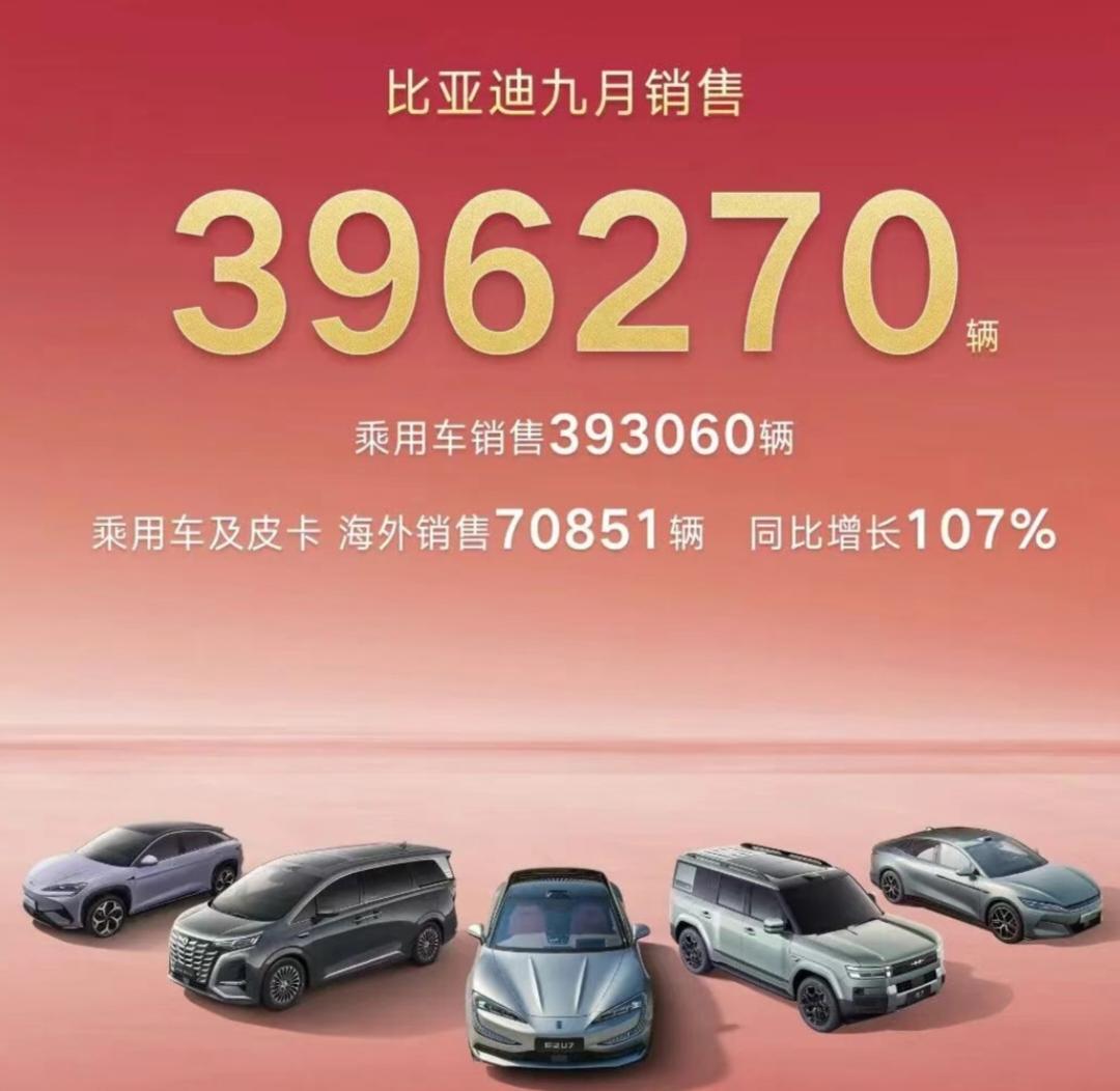 比亚迪公布了9月份销量成绩,这个数据怎么样?还是比较炸,9月共销售新车396270台,其中乘用车393060台,乘用车及皮卡海外销售70851台。 具体数据,海洋加王朝网共355774台,方程豹24121台,腾势12407台,仰望758台。 数据和其他厂商比怎么样? 吉利汽车9月销量273125台,长城汽车133639台,一汽大众(含奥迪)146385台,广汽丰田71220,上汽乘用车(自主品牌)97000台。零跑66657台,鸿蒙智行52916台,小鹏41581台,蔚来34749台,理想33951台。 比亚迪这个成绩和去年同期比略有2.3万台的降低,这也是整个市场竞争加剧的表现。不过整体的头名位置依然相当稳健,比吉利汽车这样的头部车企还多出12万台,足以说明问题,想追赶比亚迪还是有很大难度。 随着目前市面上更多竞争车型的加入,对于消费者来说是件好事,选择范围会更大。如果比亚迪想继续保持或者扩大优势,仍然需要在技术鱼池里拿出更多储备和狠活儿。对于比亚迪的厚度,个人还是很有信心的。【来自懂车帝车友圈】