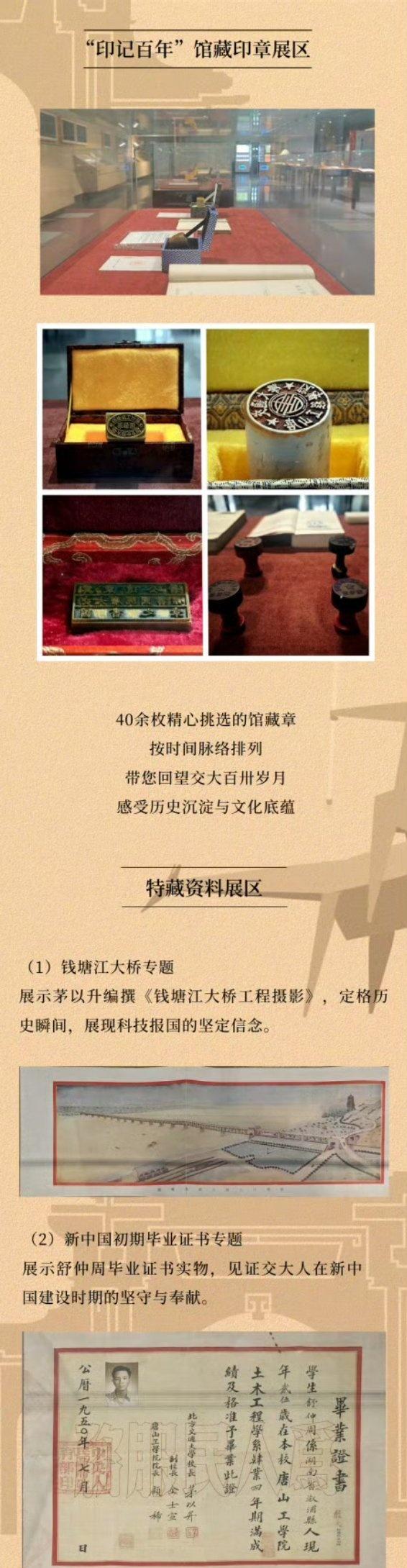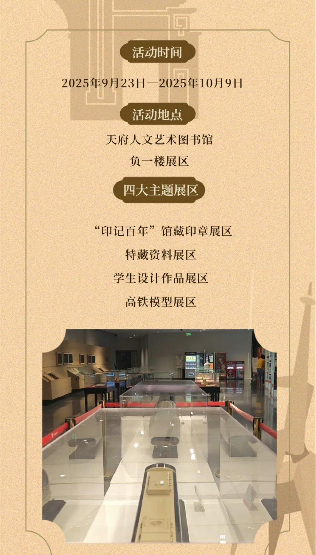 当百卅交大的厚重历史走出@西南交通大学 ,到天府人文艺术图书馆,你会看到40余枚馆藏印章钱塘江大桥历史资料、抗战时期与新中国成立初期的交大毕业证书、当代交大师生设计作品……这是一段浓缩的交大岁月,更是一部奋进的交大史诗,它像是一代又一代交大人的情感链接,连接着过去与现在,也启迪着我们未来“向何处去”。欢迎在国庆假期前往天府人文艺术图书馆聆听交大岁月深处的回响~