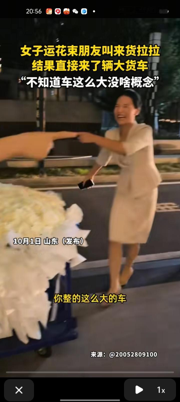 9月30日,山东临沂。客户过生日,店员叫货拉拉帮客户送花,结果开了一辆大货车,这场面让人整笑了,一辆大货车不知道是什么概念。酒店工作人员称,小姑娘不会订,叫了“半挂车”,车拉走了。
