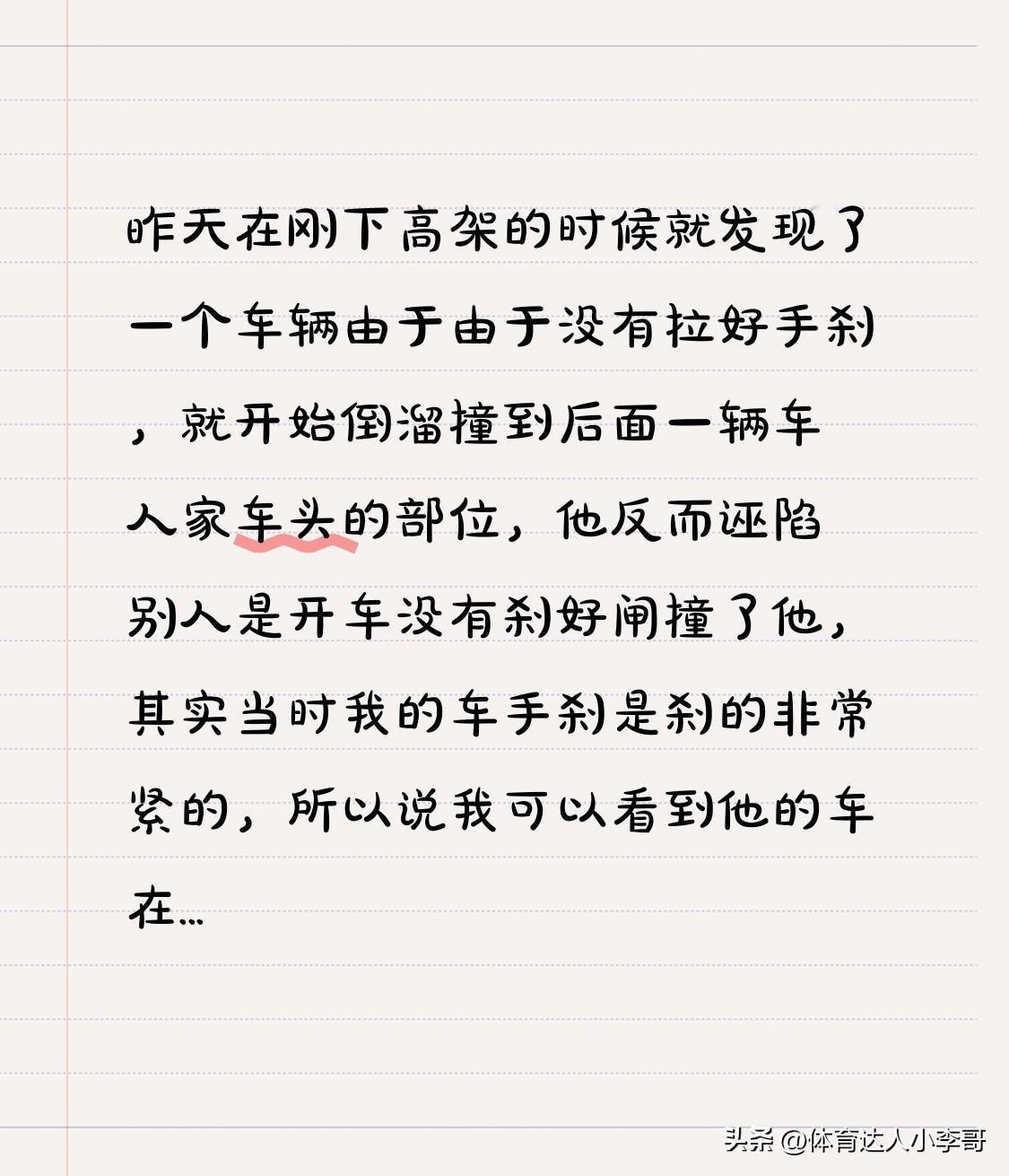 昨天在刚下高架的时候就发现了一个车辆由于由于没有拉好手刹,就开始倒溜撞到后面一辆车人家车头的部位,他反而诬陷别人是开车没有刹好闸撞了他,其实当时我的车手刹是刹的非常紧的,所以说我可以看到他的车在倒溜啊,我看他嘀咕几句,埋怨了几句,也没有追究别人撞他车的这个责任,然后他就骂骂咧咧的走了,后来那个车直接打开双闪,拿出三脚架,就开始报警说前边车肇事逃逸。我当时其实我看的清清楚楚的,但是我什么也没有说,从那一刻我都意识到,我说我之前安装的行车记录仪绝对是值了啊,因为有些事情的话,如果你没有行车记录仪的话,你拿不到关键的证据,证据没有办法维护你个人的权益,所以大家的话一定要安装行车记录仪,最好是那种哨兵模式,车的四周都可以都可以看到的那种,这样有什么事情的话,你拿着视频,对方无论怎么狡辩都没有用,因为这个社会打官司是按证据来的!