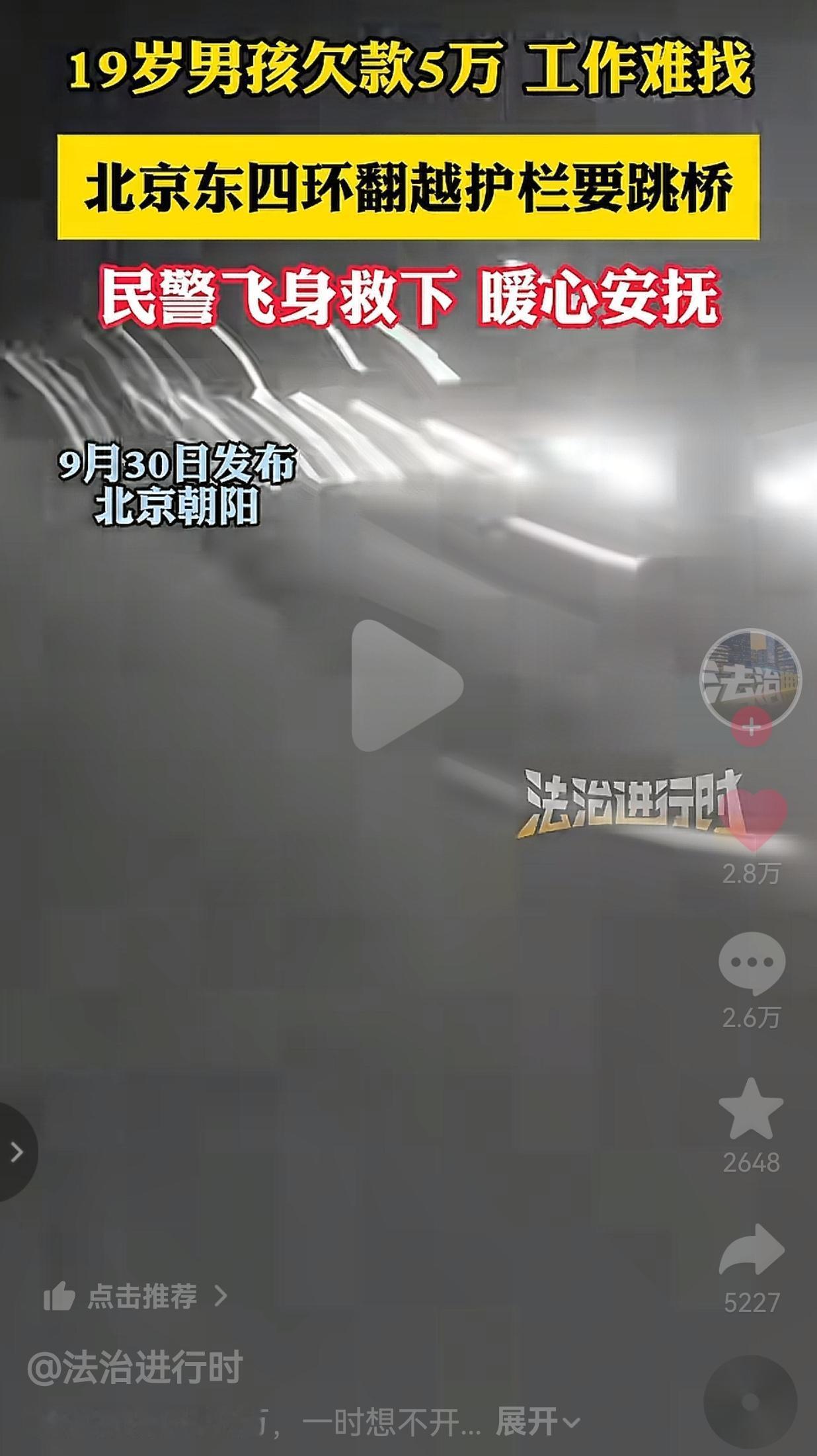 太悲催了!19岁小男生欠了5万多块钱,再加上找工作不如意,没有找到合适的工作,还不了欠款,一时间想不开竟然想跳河自杀! 幸亏民警注意到了男生,赶紧上前阻拦,并好言相劝,安抚小男生的情绪,这才避免了悲剧的发生。不然的话,后果真的不堪设想。 网友看到后评论说,傻孩子5万块钱就要买你的命啊!帮我带娃吧?我帮你还,我赚钱帮你还。 还有的网友说,不就5万多块钱吗?才19岁呀!实在不行就进厂呗!省吃俭用一点,一年多就还清了! 19岁还是一个涉世未深的孩子,为了5万多块钱,丢了生命真的不值得。 人生在世,谁也不可能一帆风顺想要什么,就能得到什么。总会遇到这样或那样的困难,如果遇到困难就选择逃避,甚至用极端的方式结束自己的生命,这不仅对自己不负责任,更寒了父母的心。你这样做,父母以后该如何生活呀! 所以,作为一名成年人,内心要变得强大一点,不要动不动就选择轻生。毕竟,活着才有希望,死了什么也没有了! 大家觉得呢?欢迎大家评论区讨论留言。