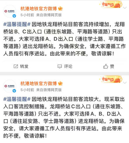 下午1点开始,龙翔桥站C口只出不进。下午2点左右,B、C口都只出不进。