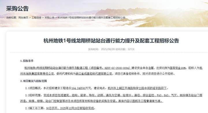 公告显示,此次升级涉及龙翔桥站车站楼梯加装、垂梯改造及站台门控制室搬迁升级改造。工程包含电梯、楼梯、站台门、站台门控制室等位置改造。施工总工期90日历天,计划2025年12月28日前验收完成。