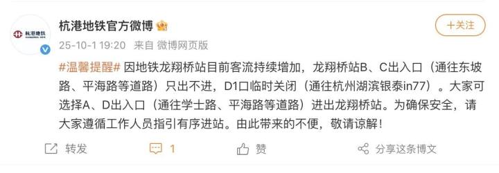 国庆假期第一天,杭州天气不错。杭州地铁“顶流”龙翔桥站,也迎来了一大波客流。