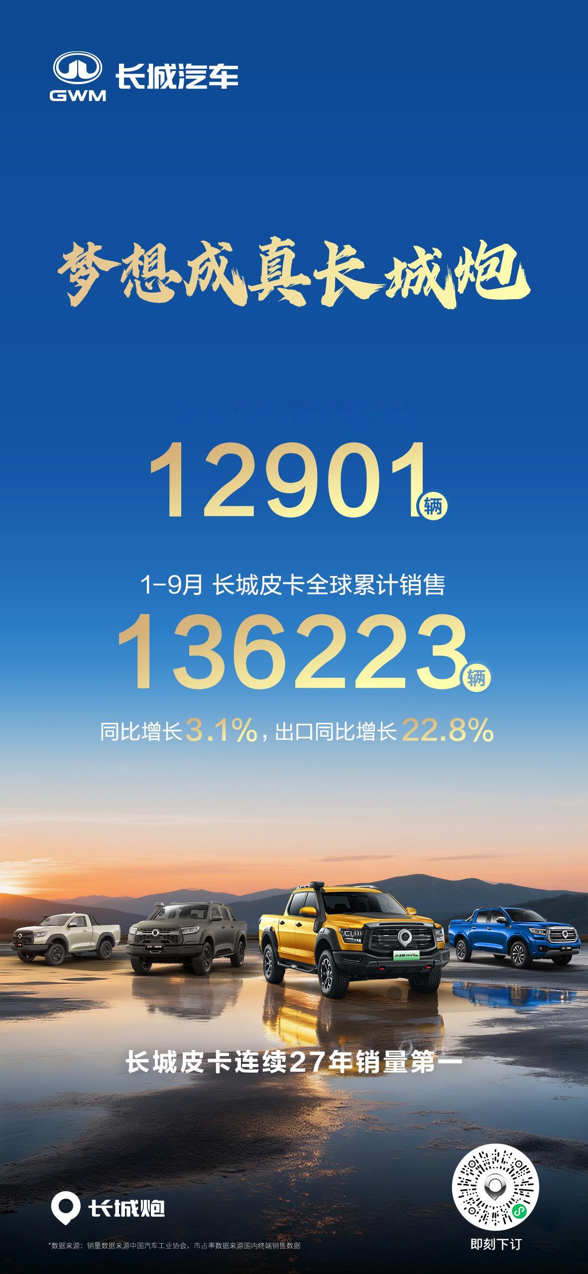 1-9月长城皮卡全球累计销售超13.6万辆,同比增长3.1%,其中出口同比增长22.8%,蝉联中国皮卡销量冠军