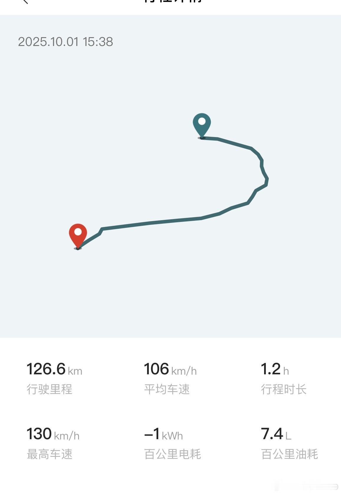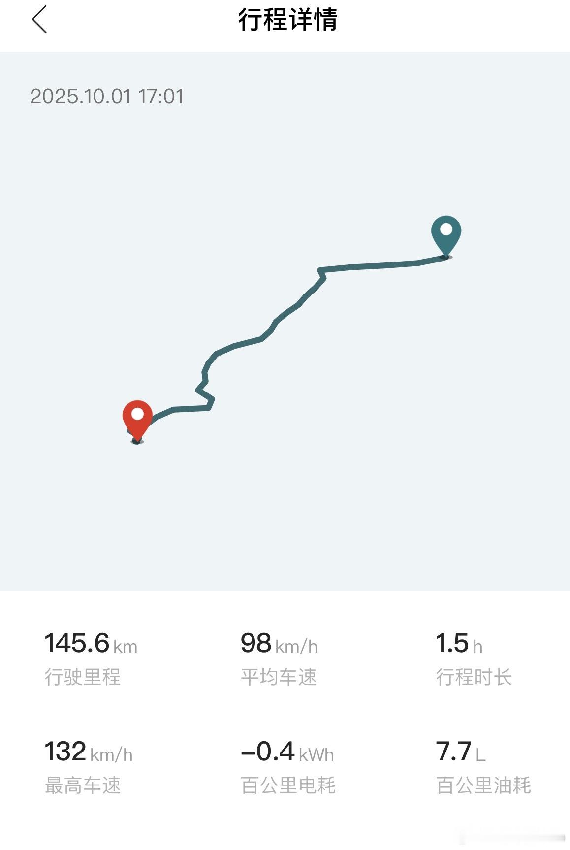 一口气干了四百多公里,五个人,后备箱装满。选了三段路程展示一下:有电情况下,油耗2.1L/100km,馈电干了300多公里,全程按照120-130的速度猛飙,温度23度两档风,油耗7.4,一个7.7,差别主要在于速度问题。这个油耗真心可以,比较满意。
