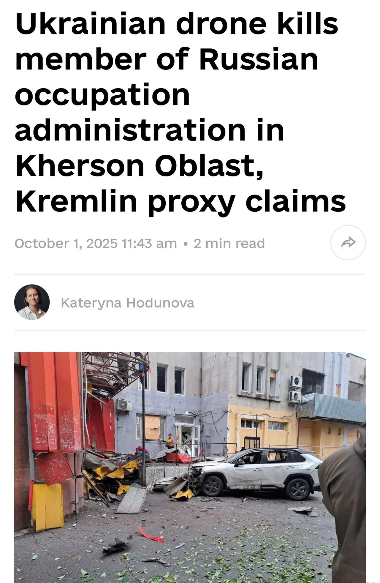 Nova Kakhovka新卡霍夫卡佔領區前行政首腦Volodymyr Leontiev列昂季耶夫在烏克蘭無人機襲擊中喪生。 據莫斯科任命的赫爾松州新卡霍夫卡地區負責人Volodymyr Saldo沃洛迪米爾·薩爾多稱,10月1日,一架烏克蘭無人機炸死了俄羅斯安插在該市被佔領城鎮的官員沃洛迪米爾·列昂季耶夫。 薩爾多稱,列昂季耶夫在Baba Yaga 無人機的襲擊中受傷,並在當天晚些時候在醫院去世。 烏克蘭尚未對此攻擊發表評論。 《基輔獨立報》已聯繫烏克蘭安全局(SBU)和軍事情報部門(HUR)徵求意見。 現年61歲的列昂季耶夫曾擔任俄羅斯安插在新卡霍夫卡地區的行政首腦,並於2022年4月——即俄羅斯軍隊控制該地區後不久——上任。隨後,他在莫斯科安插的地方議會中擔任高級職務。
