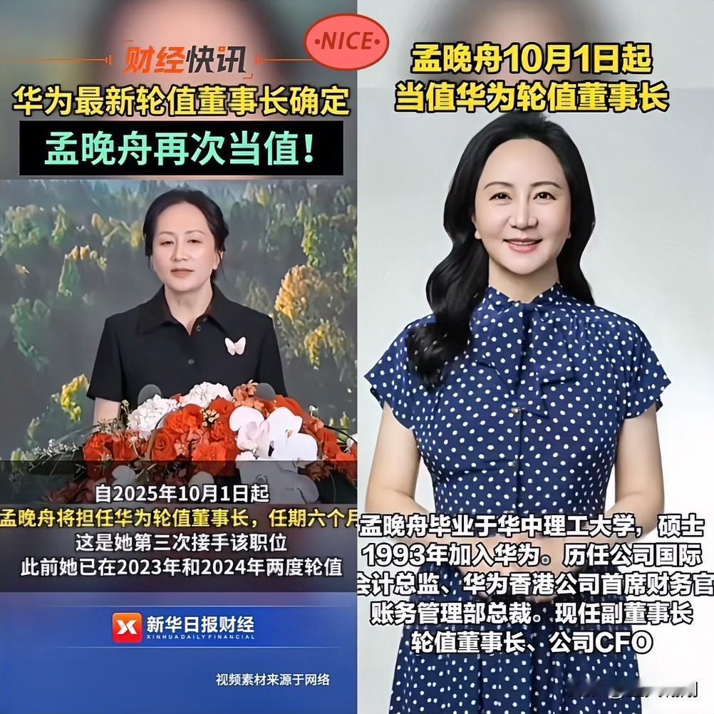 快讯!快讯! 华为事情突发! 华为正式宣布任正非女儿孟晚舟担任 轮值董事长! 这一次,任期直至2026年3月31日, 第三次挑起这副重担, 孟晚舟的底气从何而来? 2018年那场长达1028天的风波, 她以高跟鞋出庭的飒爽姿态, 让全世界记住了这位“铁娘子”。 回国后,她没有停歇, 前两次轮值期间, 稳经营、拓新局,算力、 数字化领域频频落子, 2025年直接杀进福布斯中国杰出商界 女性前三,实力有目共睹。 有人说,孟晚舟是华为的“公主”, 但30年磨砺,她早已用行动证明, 自己更是华为的“干将”。 这次人事调整,不仅是她个人的荣耀, 更是华为战略转型的关键信号。 在数字化浪潮中, 孟晚舟的领导力能否引领华为再攀高峰? 你觉得孟晚舟的这波操作, 会给华为带来怎样的新气象? 评论区聊聊,咱们一起见证历史! 华为领袖 华为公主 华为轮值制度 华为一季报 孟晚舟穿搭