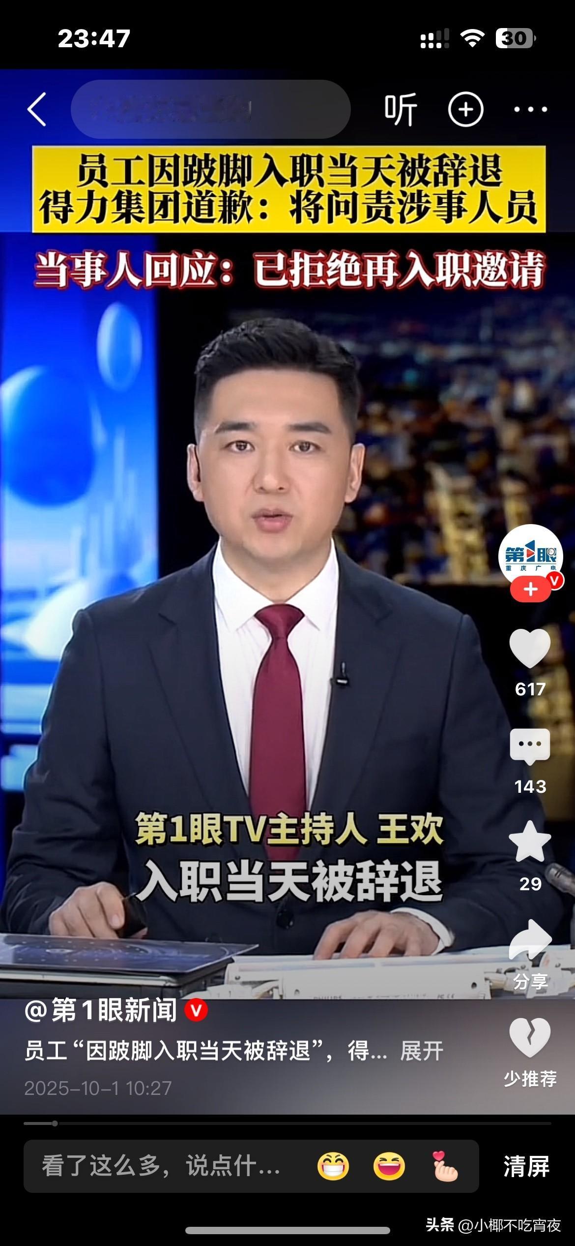 员工“因跛脚入职当天被辞退” 今年5月初,其在得力集团进行了两轮线上面试和一轮现场面试,最后通过面试收到入职通知。在当天下午入住后,人事却通知称领导确认不同意其入职。 网友评论: 晨光赶快录用。广告词我都帮你们好了:天生的缺失虽然不得力。但后天的努力你值得所有的晨光! 这种事我可以理解,但这么大一个公司给她调个不用腿的工作应该不难,不像小公司,一个萝卜一个坑,招进来干不了确实没办法,不过,反过来想,我如果是老板,就算赔钱我也不会找这样的员工,一有事就往网上发,工作中那么多事,哪个公司也受不了。 说实话:现在企业发展都困难,只要不构成欺负哥侮辱残疾朋友,得力也不存在违法! 得力也要发展,也要盈利!不然这样下去,怎么能良心循环? 说实话,任何人也不需要道德绑架! 现在的很多企业的老板只给员工购买保险,不敢给自己购买保险!为什么??????? 老板到担心企业会垮,但是员工得有保障!!! 得力首先道歉,再高层可亲自诚邀她入职。若是她不愿再来得力入职,可乘双节来临之际,奉上一些佳节礼品,略表歉意,事情即可到此为止。 一定要快一定要主动,一定要有诚意。 危机,处理不好是危险,处理得当却是一次机遇。 切勿太功利,方显名企之担当。 得力道歉能真正清除职场隐性歧视吗