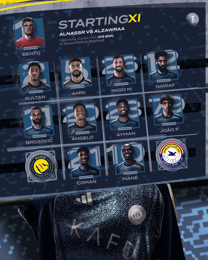 直播吧10月2日讯北京时间凌晨2点15分,亚冠二级小组赛D组第2轮,利雅得胜利客场对阵伊拉克球队扎瓦拉体育,赛前双方公布首发阵容。利雅得胜利方面,C罗轮休,菲利克斯、科曼先发,马内出战。