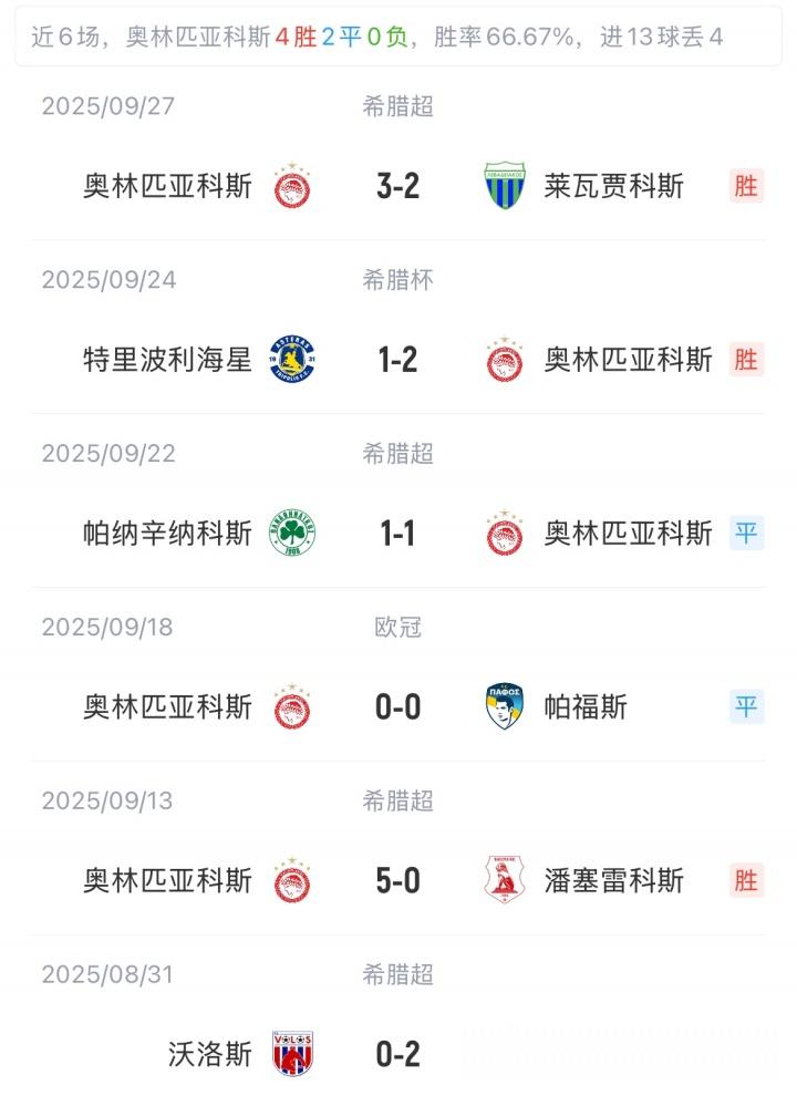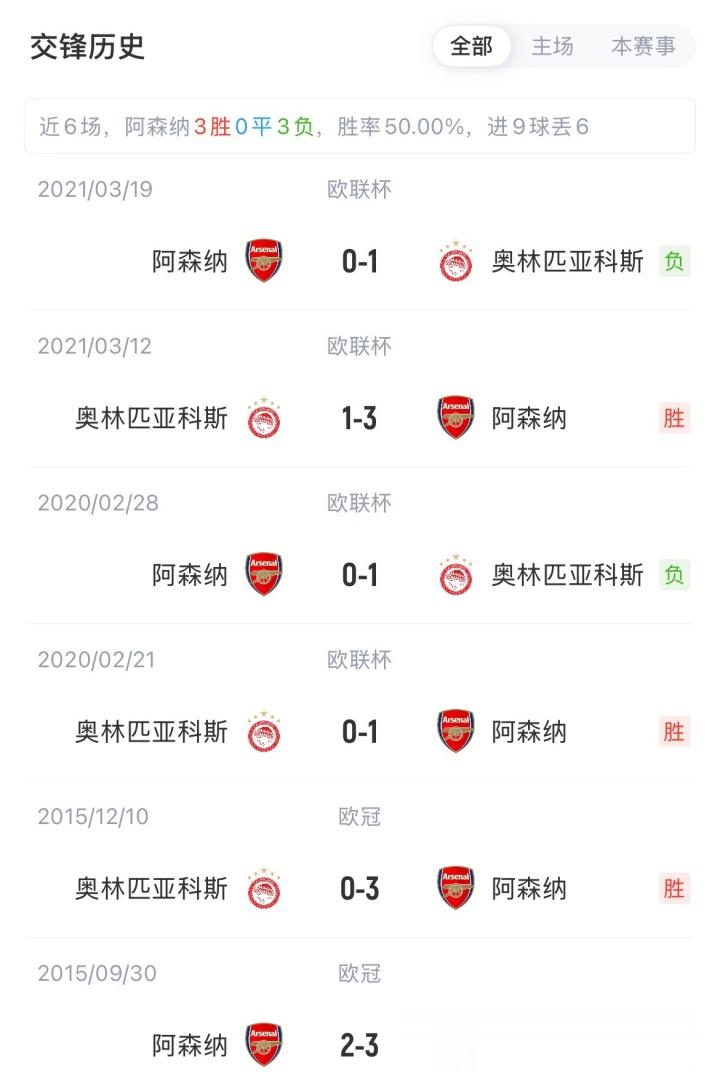 阿森纳首轮2-0客胜毕尔巴鄂,奥林匹亚科斯0-0战平帕福斯。阿森纳与奥林匹亚科斯此前在欧战共交手12次,打成6胜6负。两队上一次交手是2020/21赛季欧联杯1/8决赛,阿森纳两回合3-1、0-1淘汰对手。