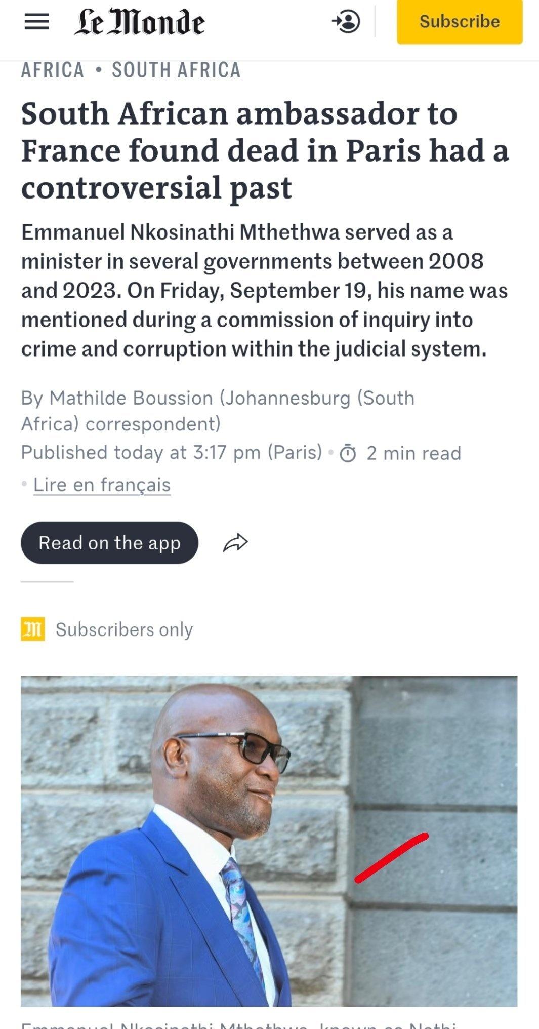¹ 从酒店22楼一跃而下,妻子最后收到短信。他今年5月还主持南非-法国投资论坛。最近被列入司法腐败调查名单。² 南非这个国家说不清,选举期间的政治暗杀多到举世闻名。³ 一位老先生语重心长说,普通人不要搞政治!