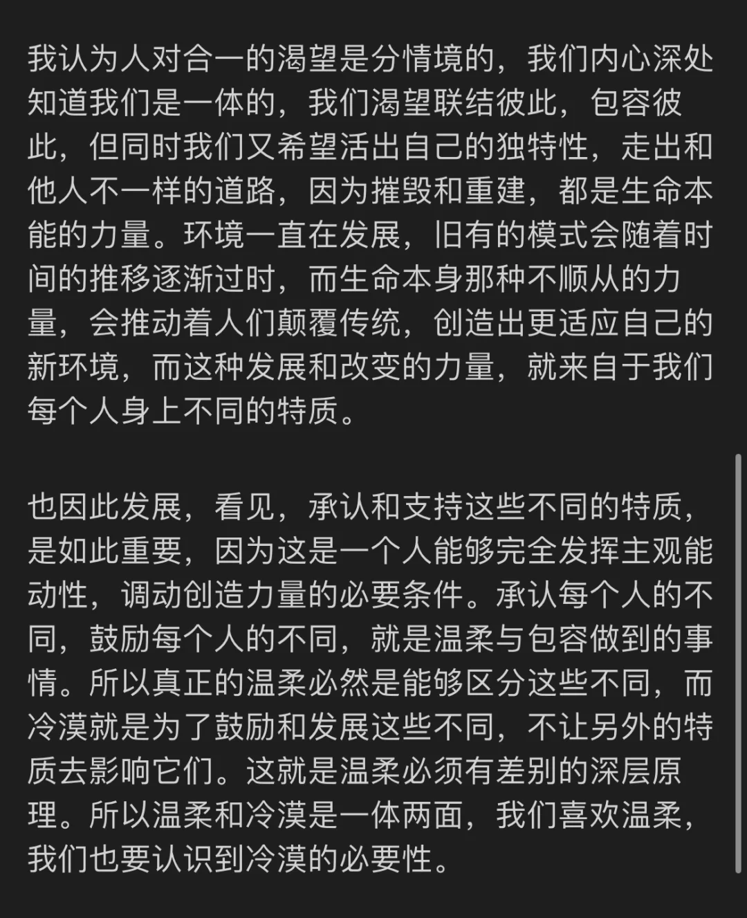 承认每个人的不同,鼓励每个人的不同,就是温柔与包容做到的事情。所以真正的温柔必然是能够区分这些不同,而冷漠就是为了鼓励和发展这些不同,不让另外的特质去影响它们。这就是温柔必须有差别的深层原理。所以温柔和冷漠是一体两面,我们喜欢温柔,我们也要认识到冷漠的必要性。
