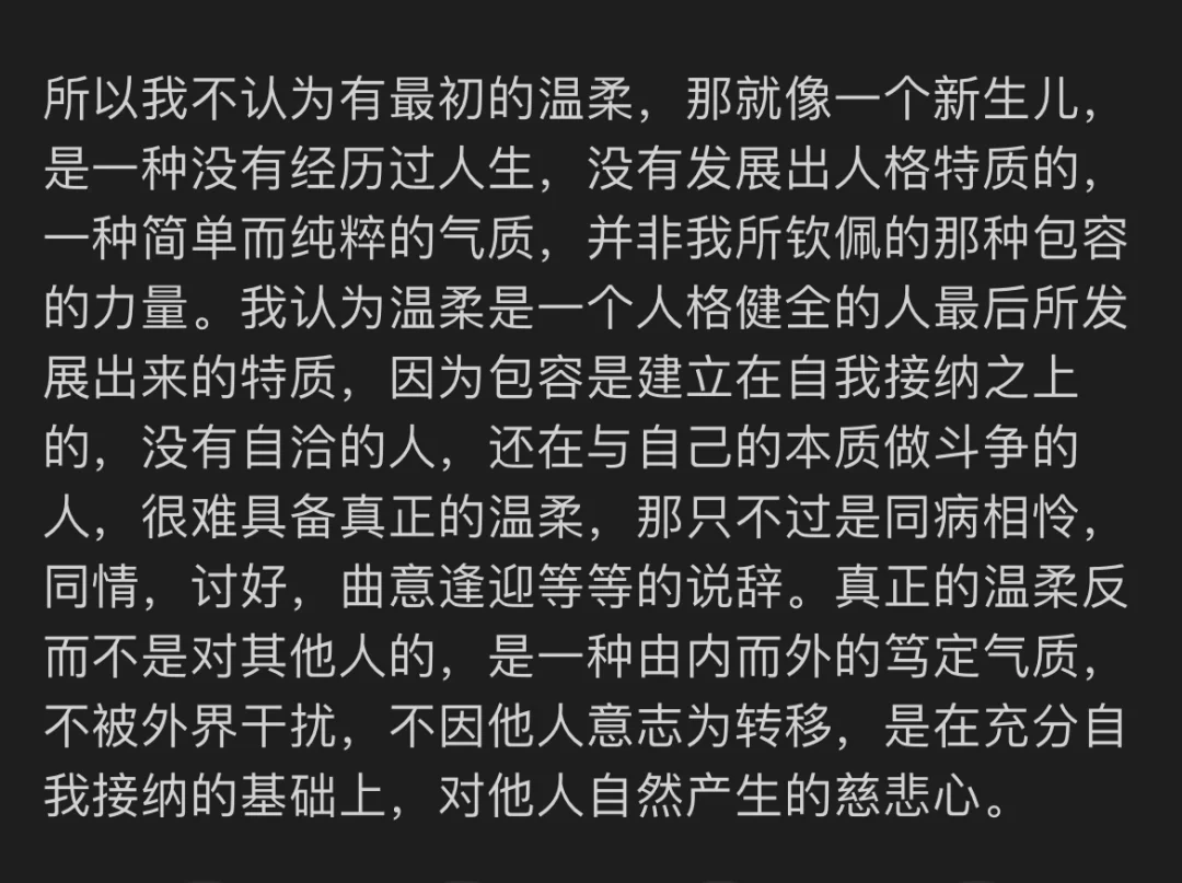 所以我不认为有最初的温柔,那就像一个新生儿,是一种没有经历过人生,没有发展出人格特质的,一种简单而纯粹的气质,并非我所钦佩的那种包容的力量。真正的温柔反而不是对其他人的,是一种由内而外的笃定气质,不被外界干扰,不因他人意志为转移,是在充分自我接纳的基础上,对他人自然产生的慈悲心。