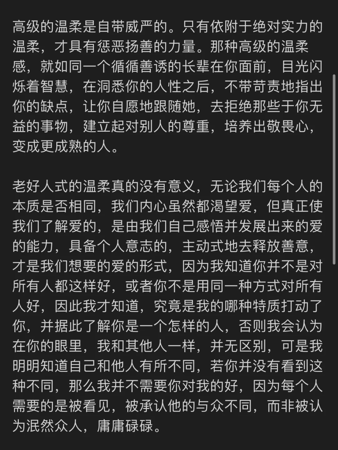 高级的温柔是自带威严的。只有依附于绝对实力的温柔,才具有惩恶扬善的力量。老好人式的温柔真的没有意义,因为每个人需要的是被看见,被承认他的与众不同,而非被认为泯然众人,庸庸碌碌。