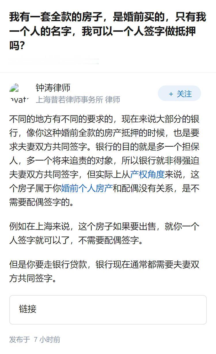 我有一套全款的房子,是婚前买的,只有我一个人的名字,我可以一个人签字做抵押吗?