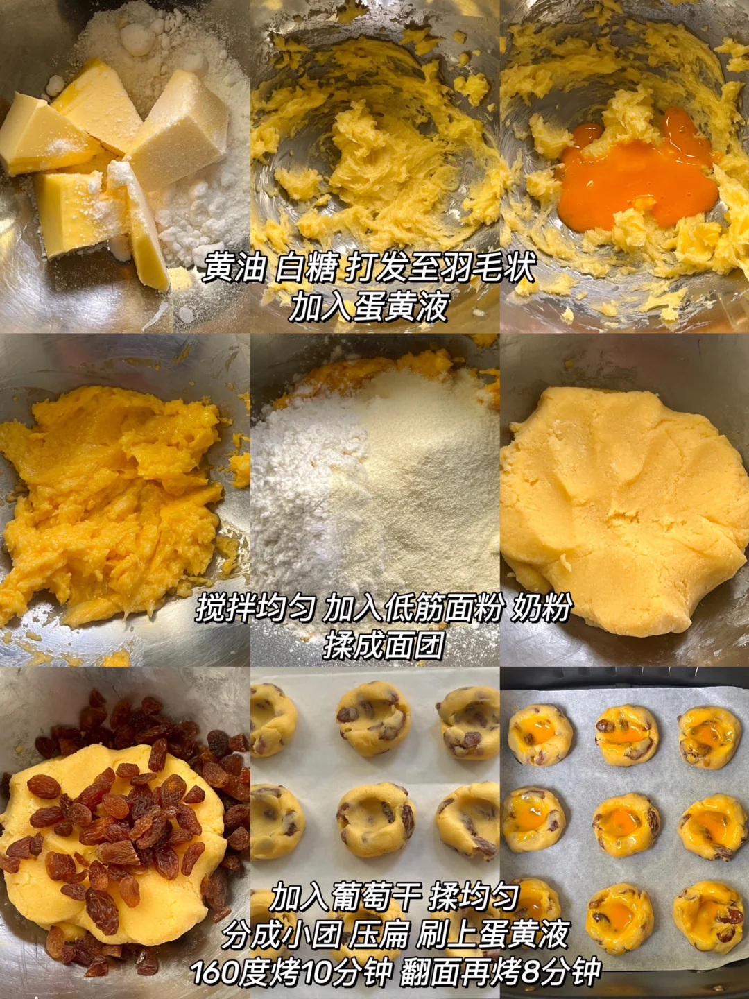 材料:黄油80g 蛋黄两个 白糖30g 低筋面粉115g 奶粉45g