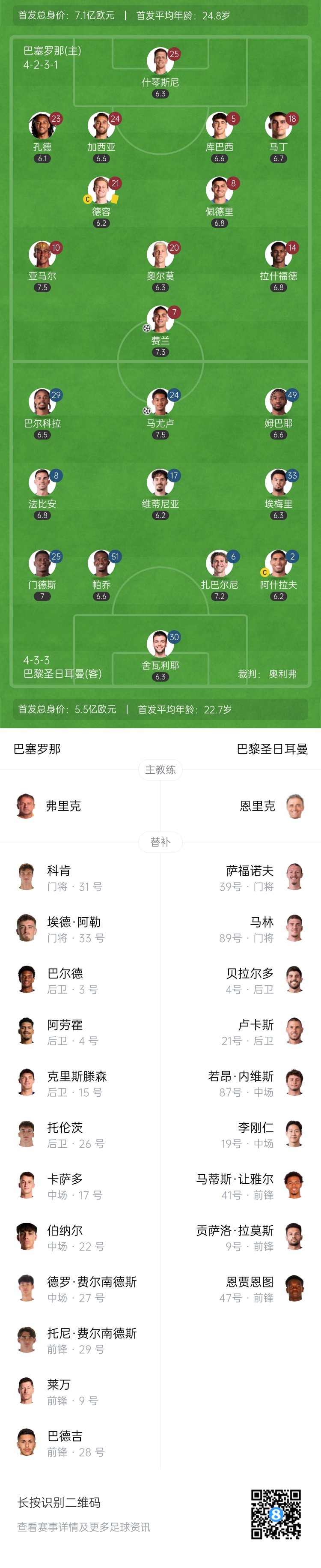 第19分钟,巴萨中场位置亚马尔抢断就地反击,弧顶佩德里分球左侧跟进的拉什福德,后者送出斜塞横敲门前,费兰跟进铲射包抄入网,巴萨1-0领先↓