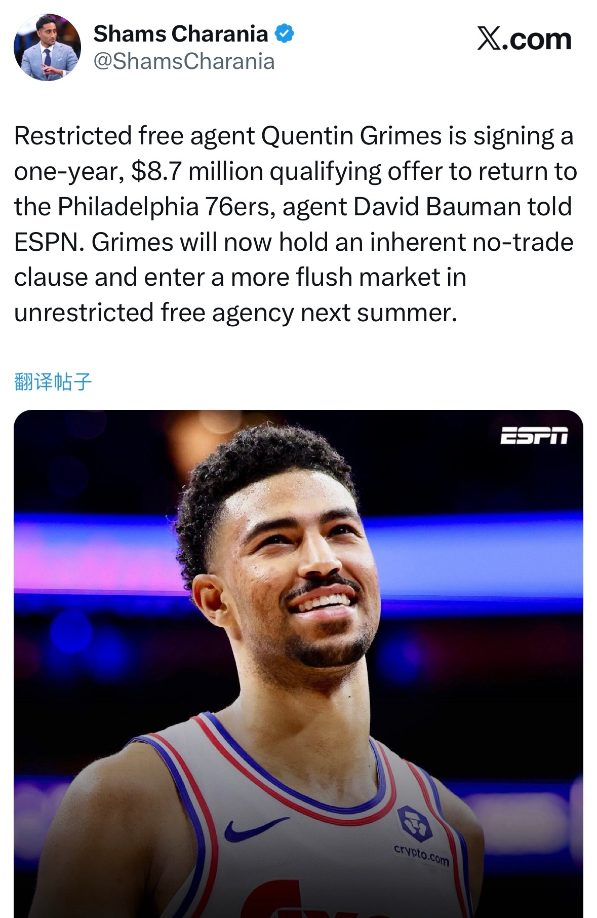 Shams:受限制自由球员昆廷·格莱姆斯将签下一份为期一年、价值870万美元的资质报价,回归费城76人队。