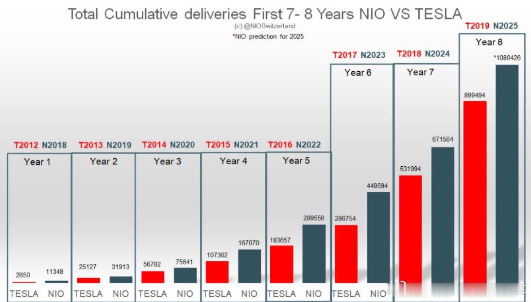 NIO vs Tesla前8年累积交付数据,当然Tesla那个年代的难度比NIO还是高一个Level,当然NIO也有自己的不同维度的难度