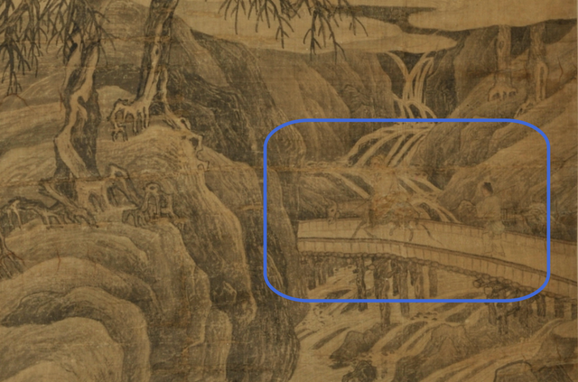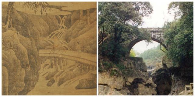 左为唐寅《匡庐图》(局部),右为如今庐山的观音桥。