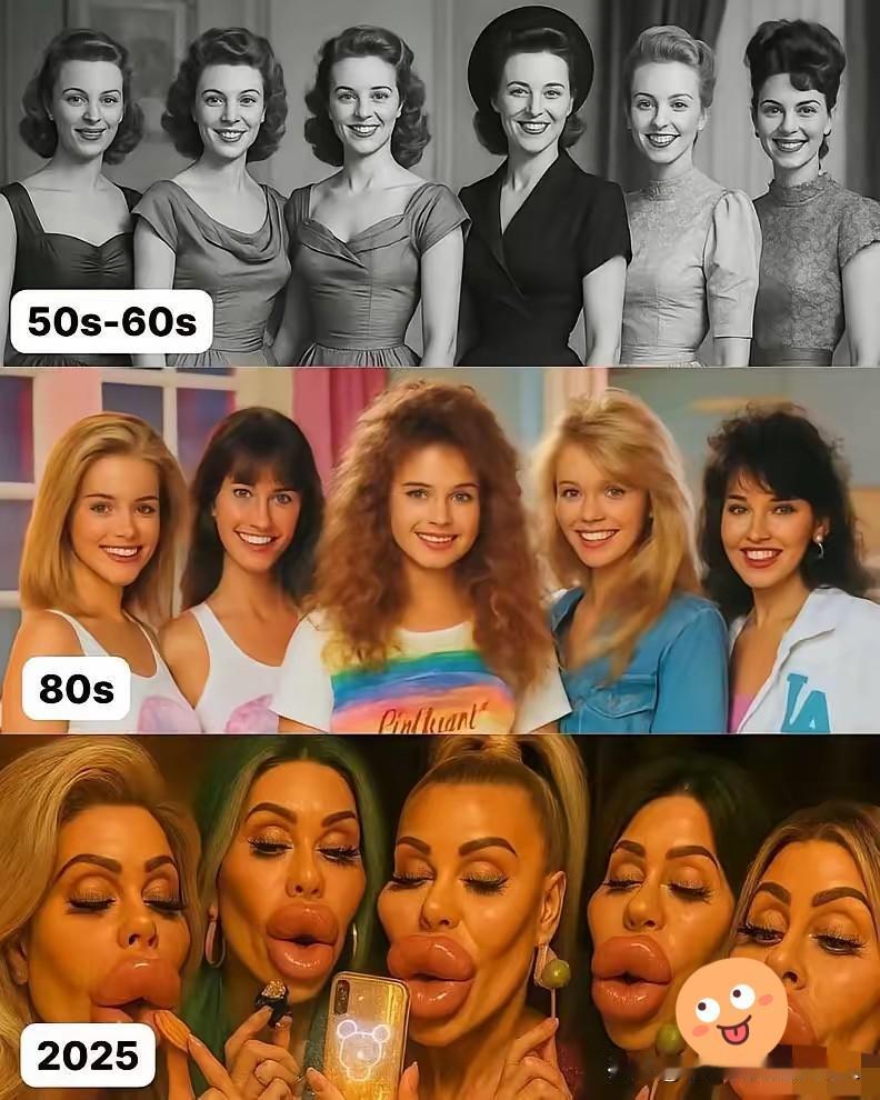 美国社会审美演变。 不好评价。 就是,辣眼睛![捂脸] 好在我们东大没受影响,审美一直在线:肤白貌美大长腿,柳叶弯眉樱桃嘴![呲牙]