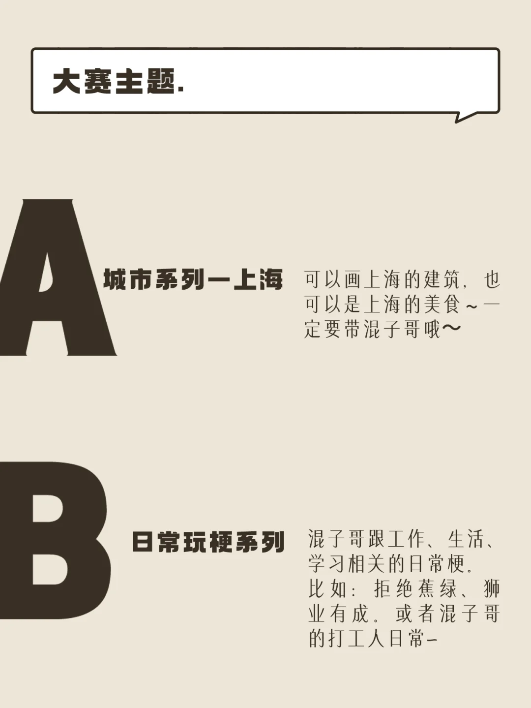 B.日常玩梗系列,ex:拒绝蕉绿、狮业有成,或打工人的日常等(但是一定要有混子哥形象)