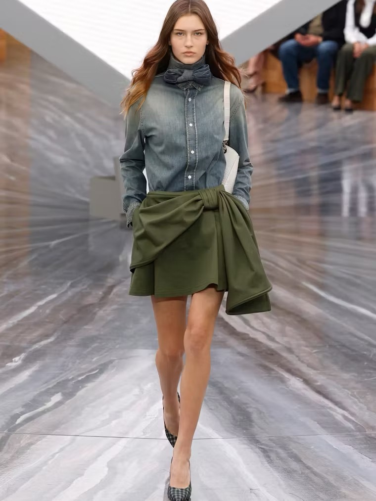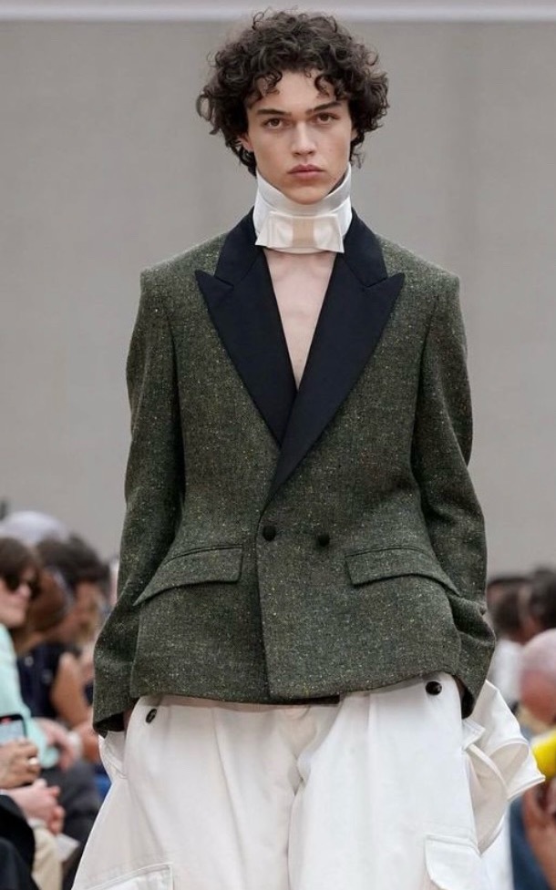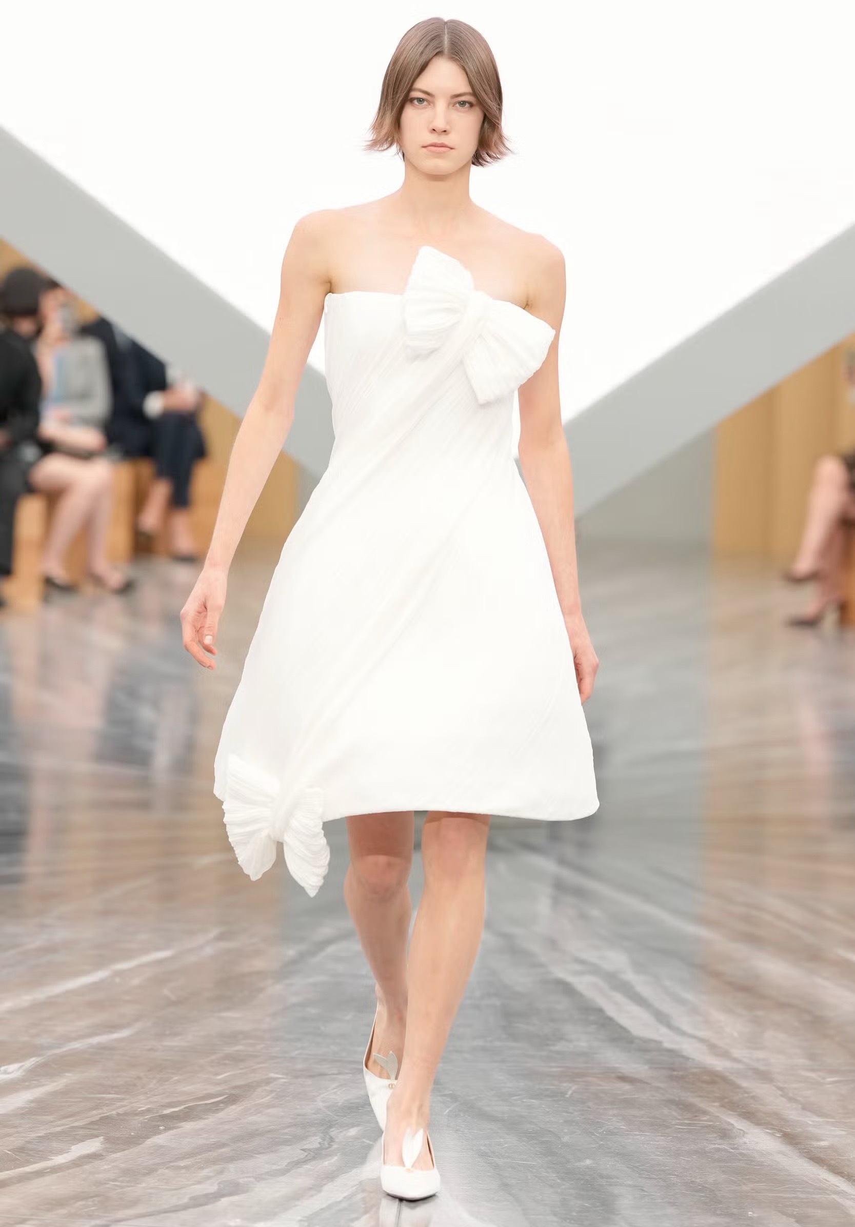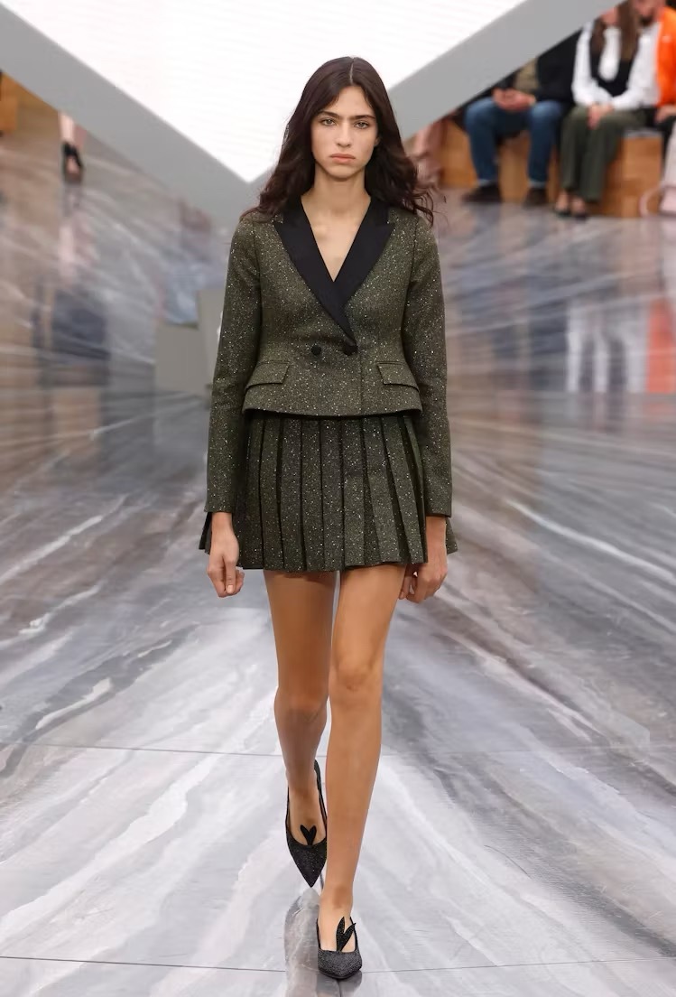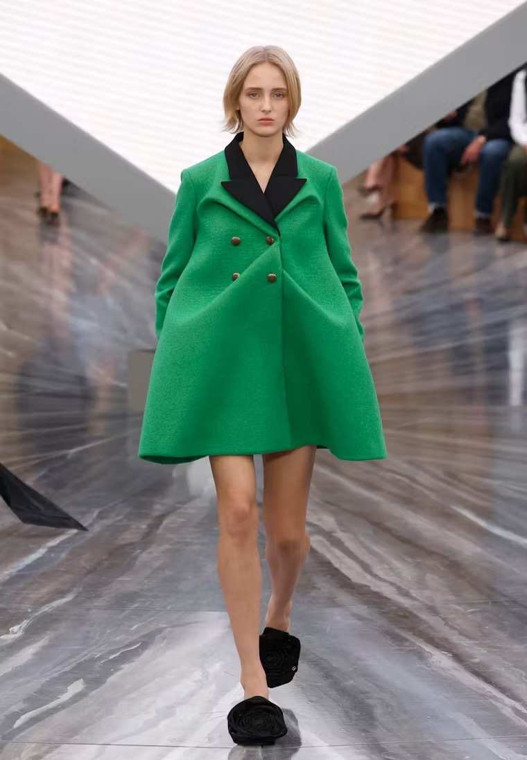 Jonathan Anderson 的 Dior 女装首秀,很像一场“情侣对话”。男装里的军装卡其,被他变成裙装和风衣;蝴蝶结不再只是甜美符号,而是能撑起雕塑感礼服,也能点缀在男士造型中。绿色大衣、针织套装、披肩成双成对出现默契呼应。