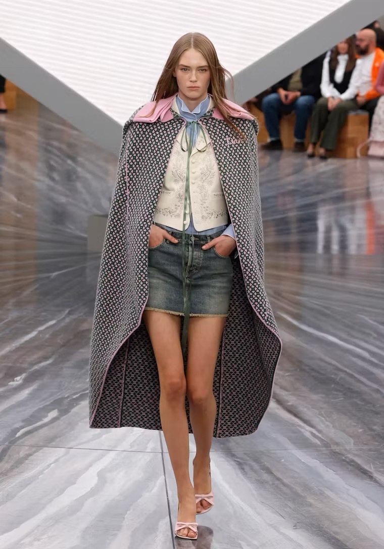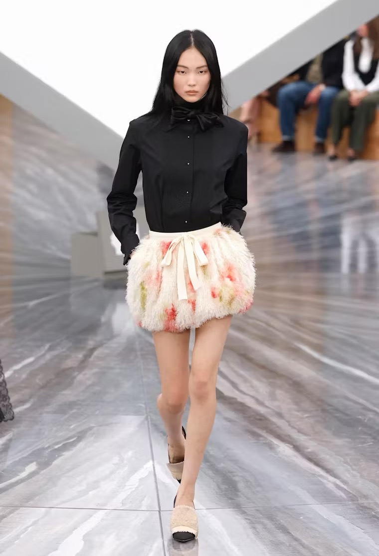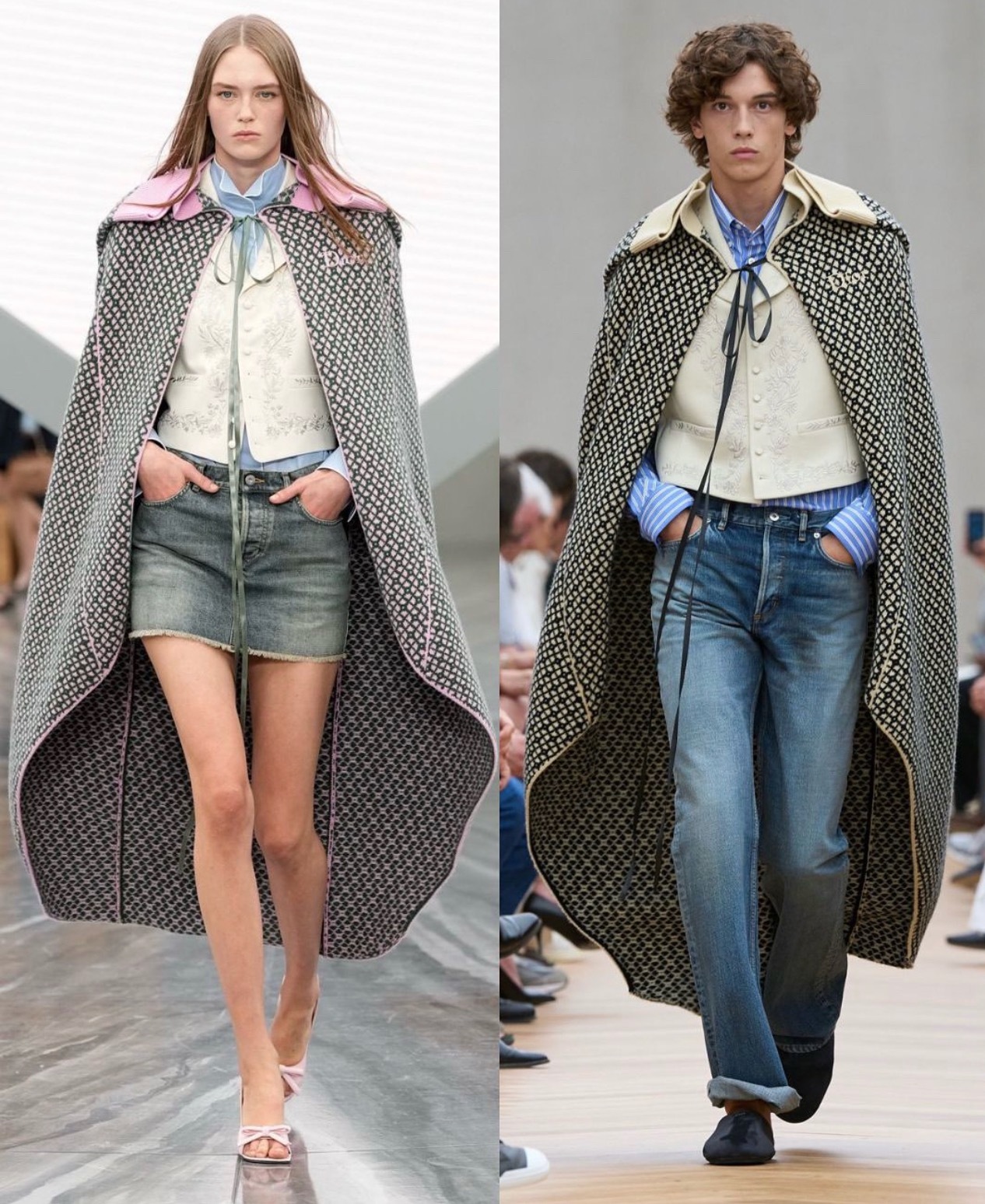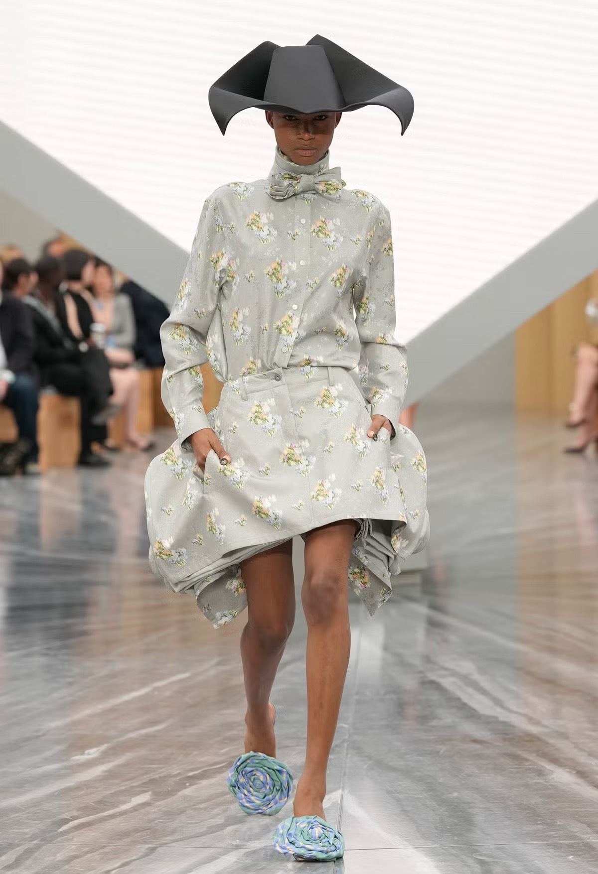 Jonathan Anderson 的 Dior 女装首秀,很像一场“情侣对话”。男装里的军装卡其,被他变成裙装和风衣;蝴蝶结不再只是甜美符号,而是能撑起雕塑感礼服,也能点缀在男士造型中。绿色大衣、针织套装、披肩成双成对出现默契呼应。