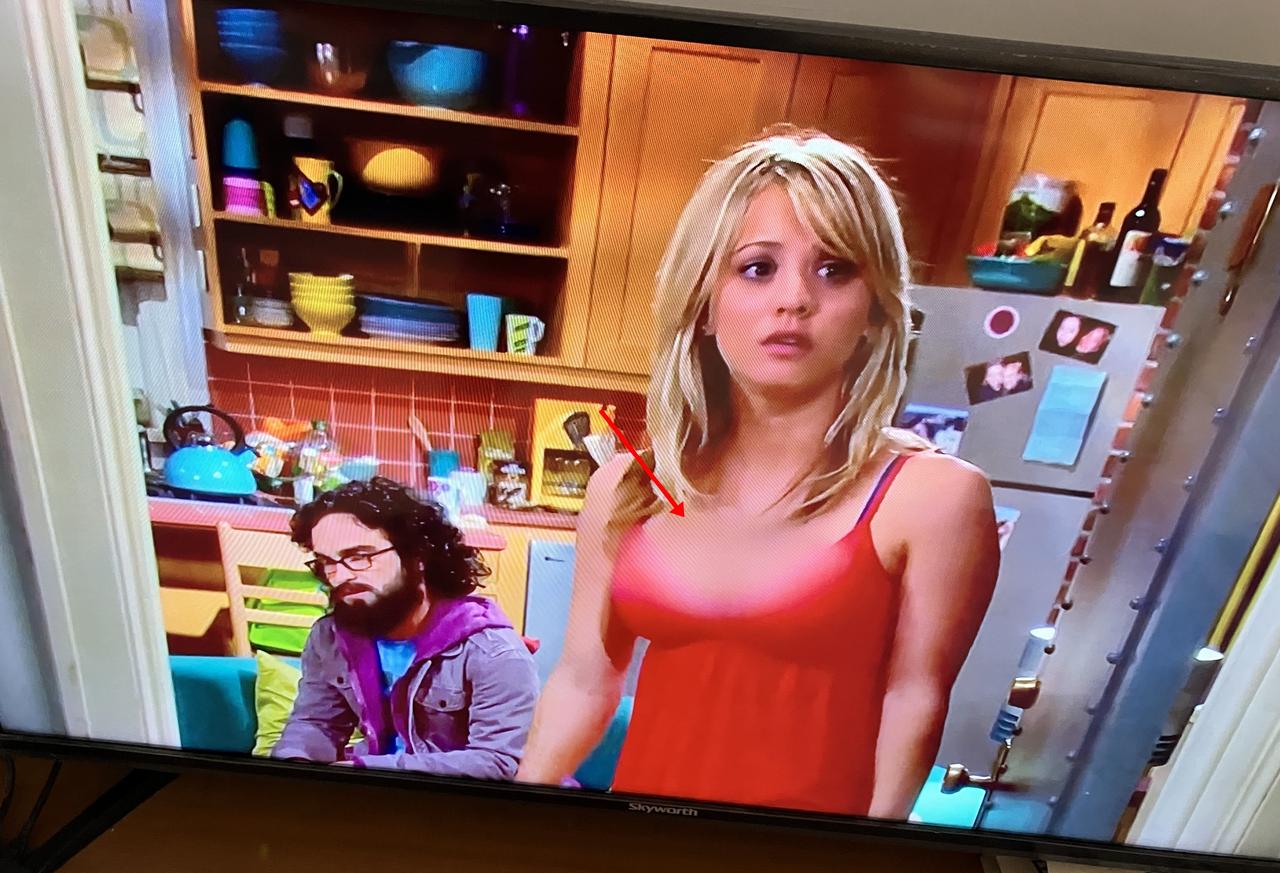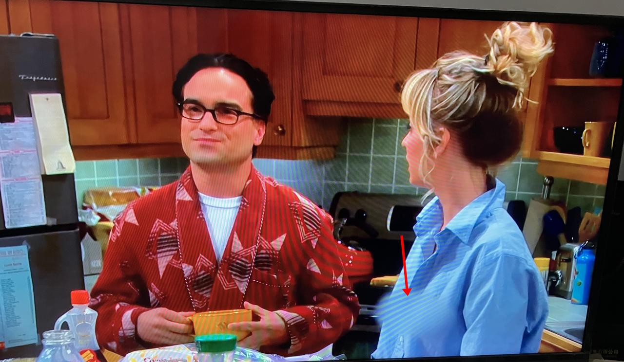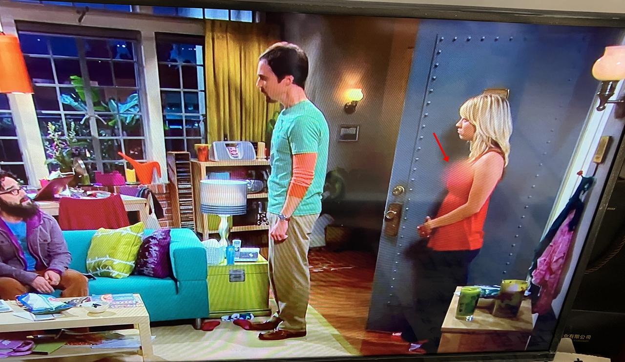 昨天国庆在家呆了一天,打开电视想轻松一下,于是看了几集美国情景喜剧《生活大爆炸》。 本来是想乐一乐的,但却越看越郁闷。那漂浮在女演员胸前的一团白雾,像个白内障一样嘲讽地看着我:你是个活在2025年的现代人又怎样?不还是只配看打码的喜剧吗? 看前几集时我以为那团白雾只是女演员露出“事业线”时才出现,但看到后面竟然发现,女演员穿着规规矩矩的蓝衬衫时,白雾也挡在她的胸前(图五)。简直疯了。 想骂几句,又不知该说什么。如鲠在喉。 以前看到报道说某些阿拉伯国家的电视台给奥运会沙滩女子排球赛的国外队员胸前打码时,我还曾当笑话一样看。现在觉得自己挺浅薄的,五十步笑百步。