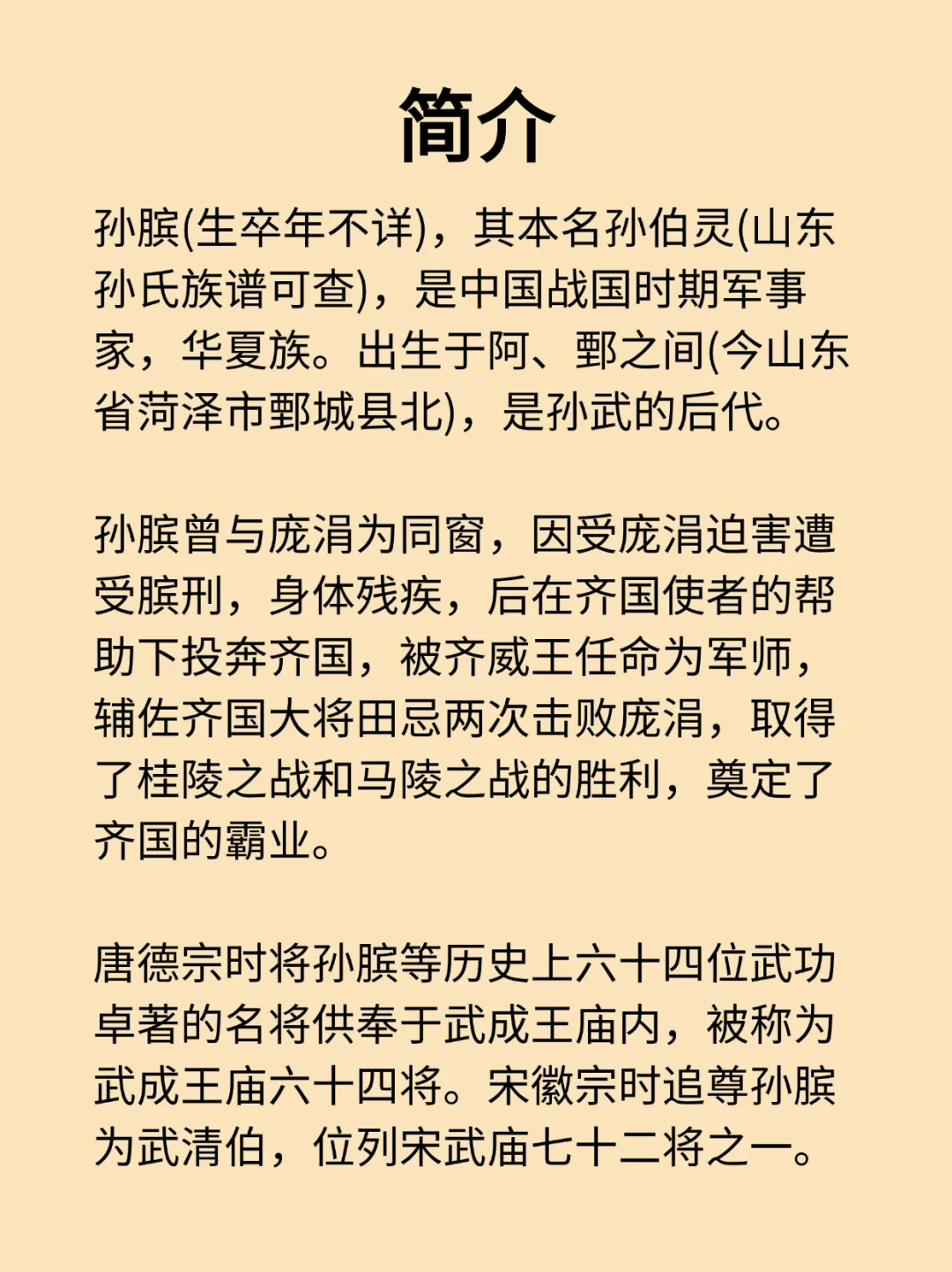 👉唐德宗时将孙膑等历史上六十四位武功卓著的名将供奉于武成王庙内,被称为武成王庙六十四将。宋徽宗时追尊孙膑为武清伯,位列宋武庙七十二将之一。