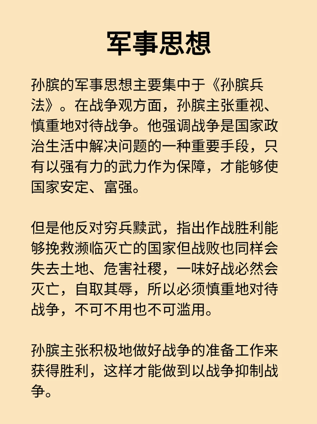 🍀孙膑曾与庞涓为同窗,因受庞涓迫害遭受膑刑,身体残疾,后在齐国使者的帮助下投奔齐国,被齐威王任命为军师,辅佐齐国大将田忌两次击败庞涓,取得了桂陵之战和马陵之战的胜利,奠定了齐国的霸业。