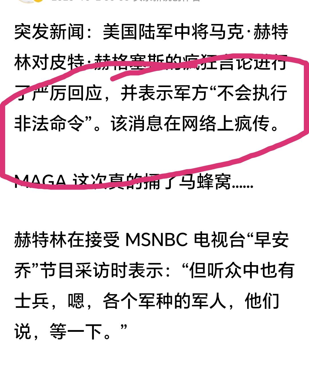 美国战争部长赫格塞思这次烽火戏诸侯麻烦惹大了,本想搞个服从性测试,结果美国军方代表说他们不会执行非法命令。 什么是非法命令?看来美军将领有自己的判断。[笑哭] 800多名将军不远万里回到华盛顿就是听一个小排长训斥他们要整理内务刮胡子减肥增强体能。 小排长训令中还有一条,不寻求与中国的战争。因为以前他们钢多气少的时候都没有打赢。现在看到中国93阅兵后,现在美国钢也少了,而且在他们有生之年也看不到可以再次超过中国的机会,那就只有把气往上提一提了,但是真的行吗?[吃瓜群众] 点右上角关注我,我们一起看这个魔幻的世界
