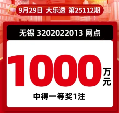 9月29日(昨晚),超级大乐透第25112期开奖。无锡3202022013网点,中得一等奖1注,奖金1000万元。