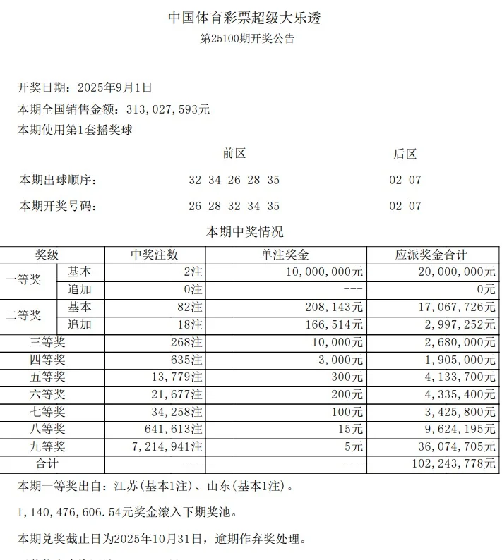 9月1日,超级大乐透第25100期开奖。前区开出号码26、28、32、34、35;后区开出号码02、07。本期全国销售3.13亿元,为国家筹集彩票公益金1.12亿元。
