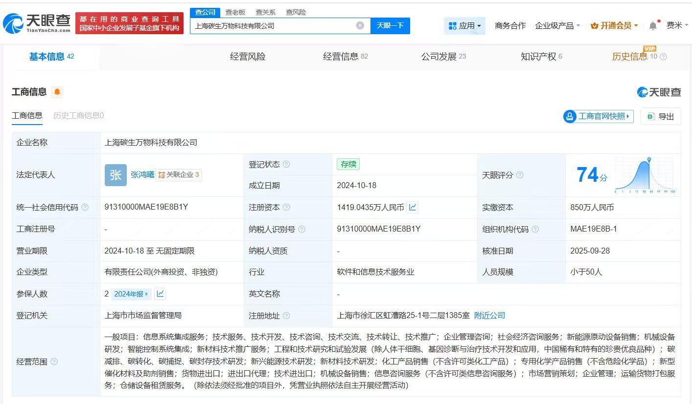 该公司成立于2024年10月,法定代表人为张鸿曦,经营范围包括信息系统集成服务、企业管理咨询、社会经济咨询服务等,现由YuxiangRen、张鸿曦及上述新增股东等共同持股。公开资料显示,该公司聚焦碳科技与新材料领域创新应用,致力于为化工、能源行业提供清洁技术解决方案。
