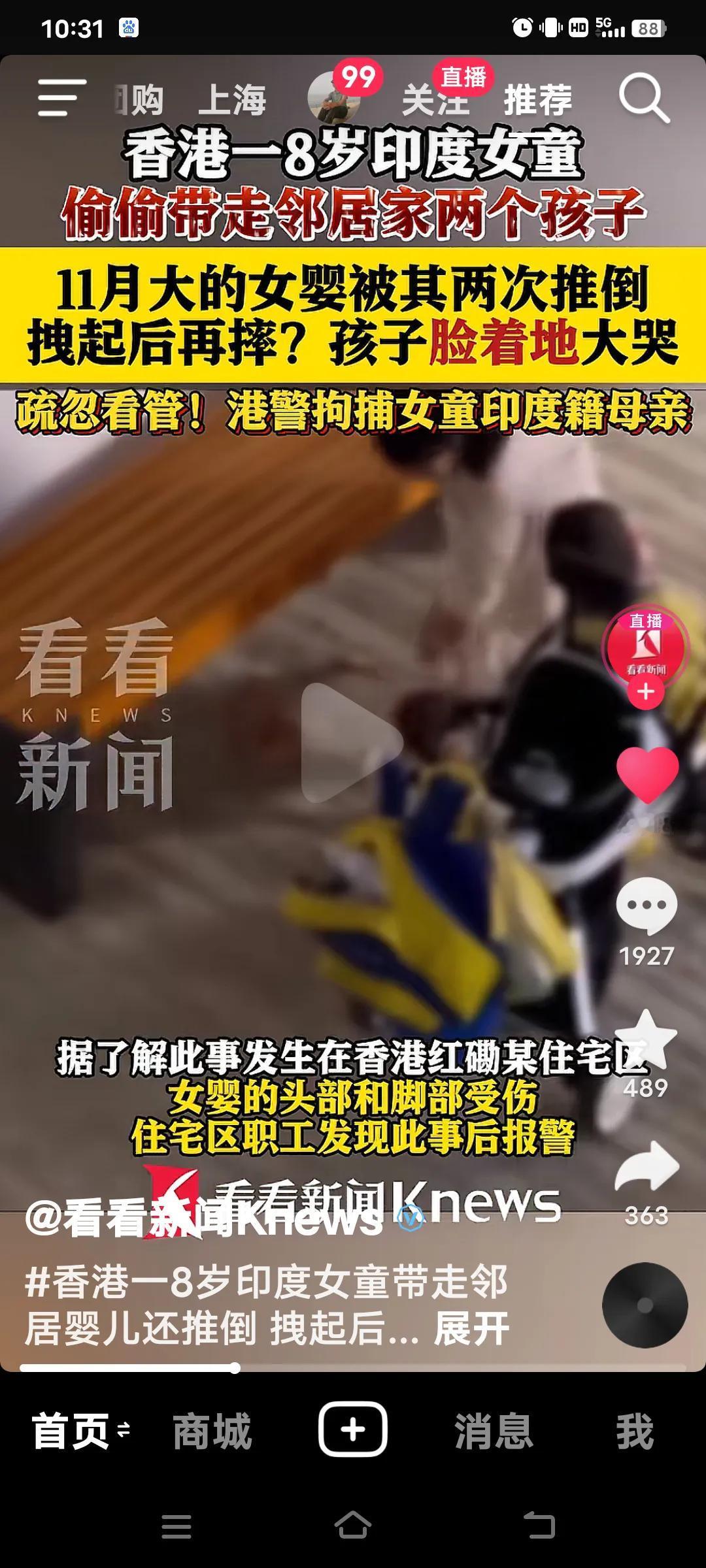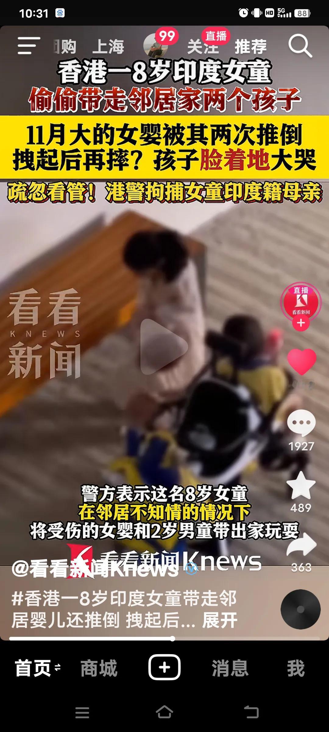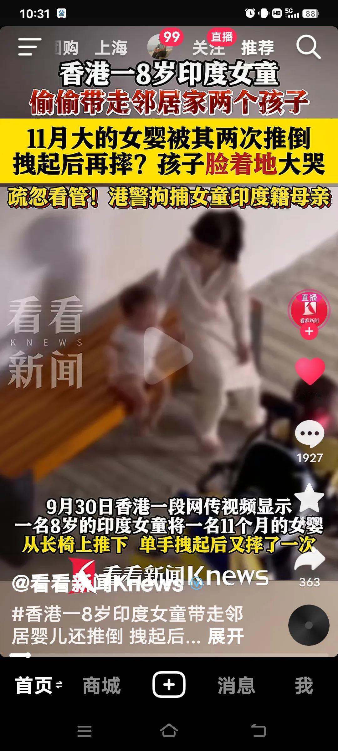 9月30日香港这事儿真让人惊掉下巴。一个8岁印度裔女童,在俩幼童监护人不知情时,把11个月大女婴和2岁男童带出门。视频里,女童把女婴从长椅推倒,还扯起左手又让其掉落,女婴嚎哭不止。女婴头部和脚部受伤。 住宅职工发现此事后报警,区警方以“对所看管儿童或少年人虐待或忽略”把8岁女童37岁的母亲拘捕,她已获保释。这不禁让人思考,孩子犯错,家长监管责任重大。 一个8岁的孩子了。啥不懂啊?这是骨子里的坏呀!这样的事情可不值一谱。前些年四川一个也是和这女孩差不多年龄比她还残忍一万倍,她把邻居的2岁女幼童偷偷带走,后来把这个幼童从高楼窗口处扔下,导致幼童多处骨折,治疗费用花了好多钱,也难以恢复正常呀?最后这个坏女孩被大人带到外地上学了。 根本不管不问幼童的状况。这样的情况就得惩罚家长吧,听了都让人心疼呀,那是一条生命,怎么能如此歹毒呀!印度女童悲剧 印度女童 香港女婴 香港女童 香港小朋友 香港萌娃