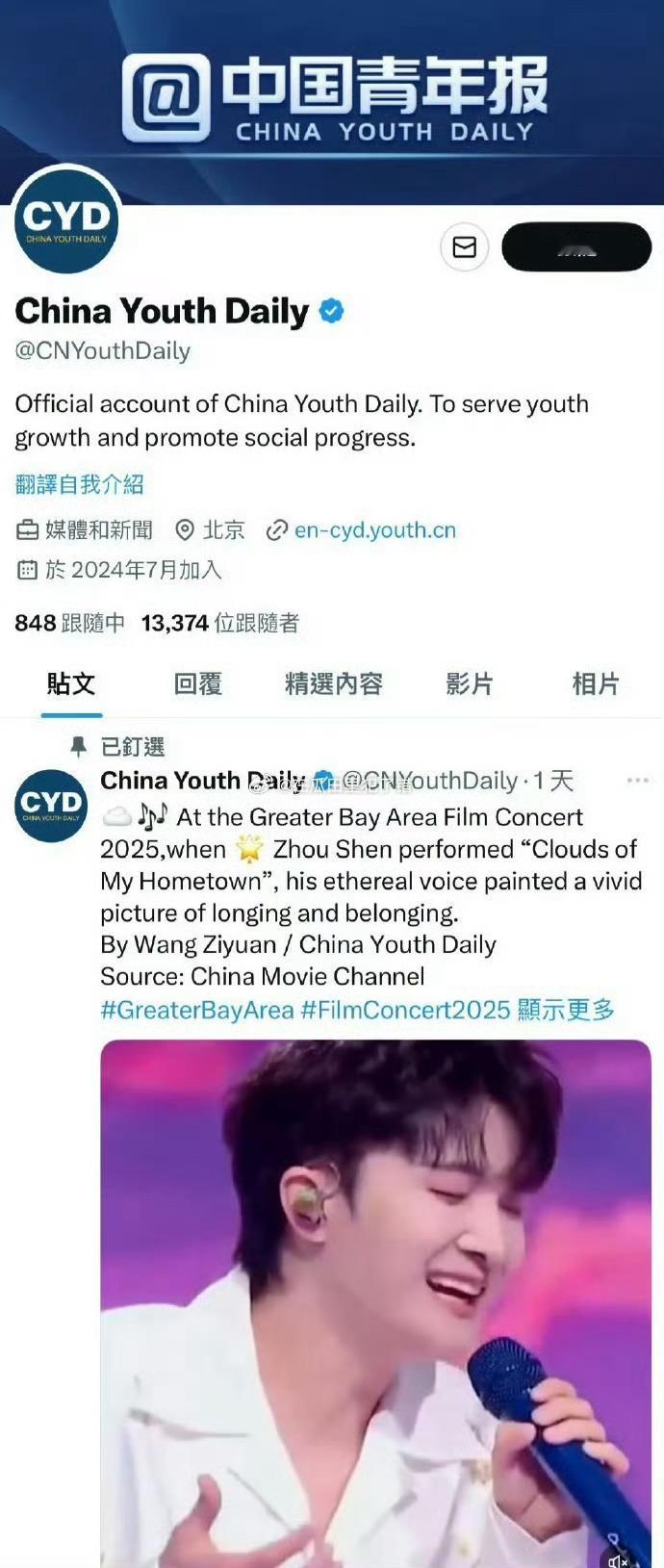 China Youth Daily报道 在X上也置顶了周深湾区升明月舞台 ​​​