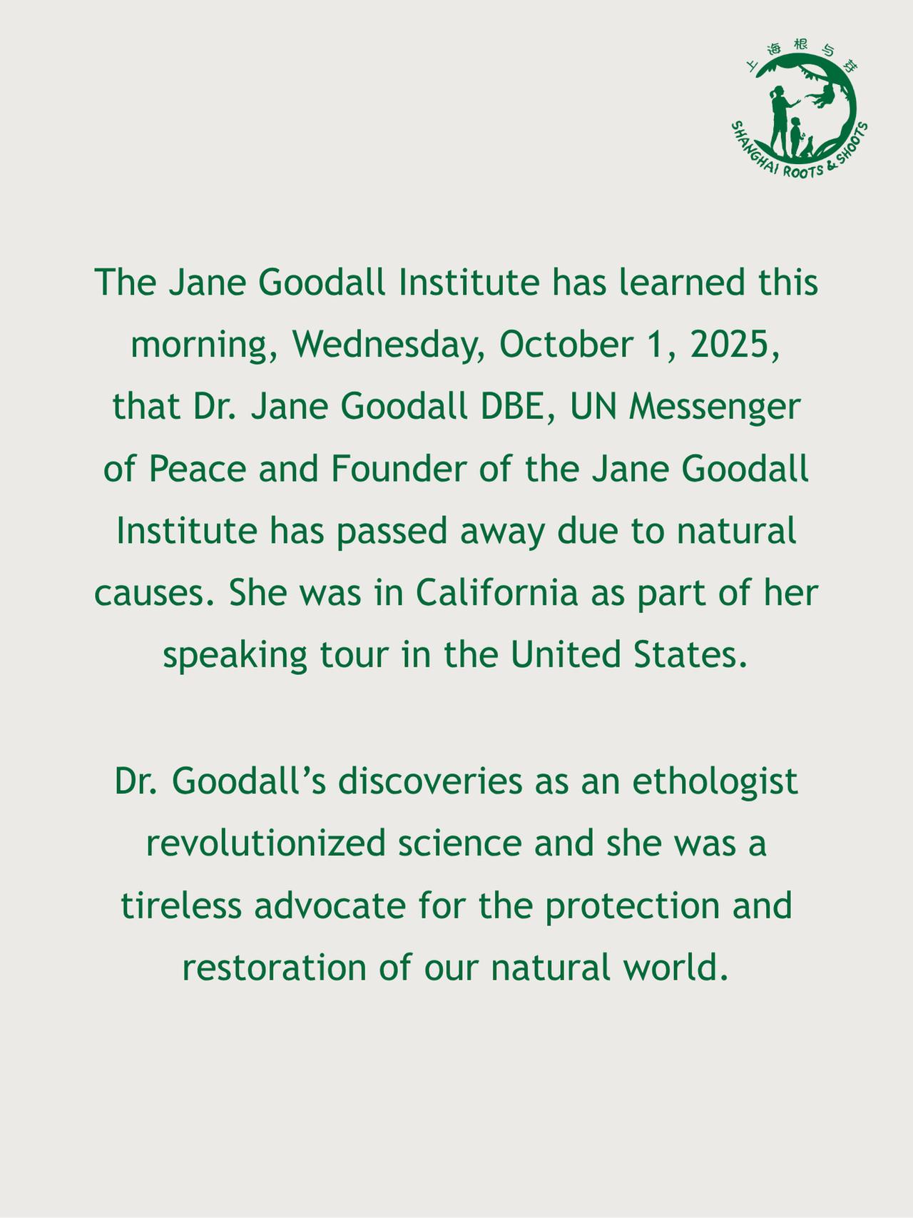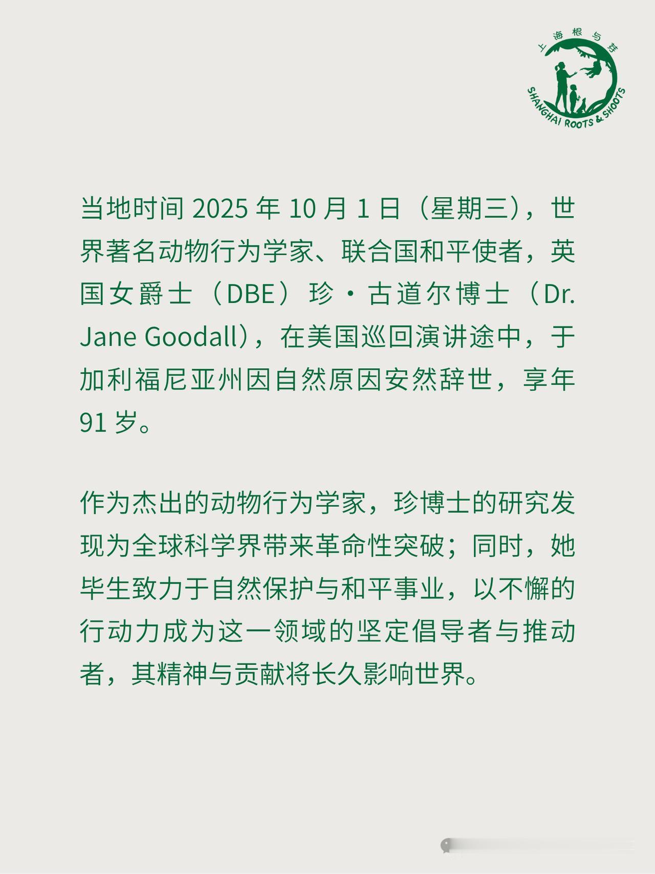 著名动物行为学家和环保主义者珍·古道尔博士安然辞世,享年91岁 当地时间 2025 年 10 月 1 日(星期三),世界著名动物行为学家、联合国和平使者,英国女爵士(DBE)珍・古道尔博士(Dr. Jane Goodall),在美国巡回演讲途中,于加利福尼亚州因自然原因安然辞世,享年 91 岁。 作为杰出的动物行为学家,珍博士的研究发现为全球科学界带来革命性突破;同时,她毕生致力于自然保护与和平事业,以不懈的行动力成为这一领域的坚定倡导者与推动者,其精神与贡献将长久影响世界。