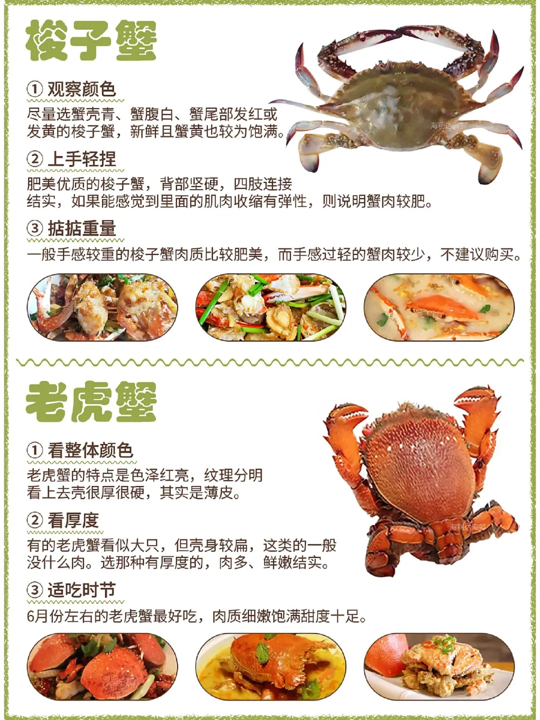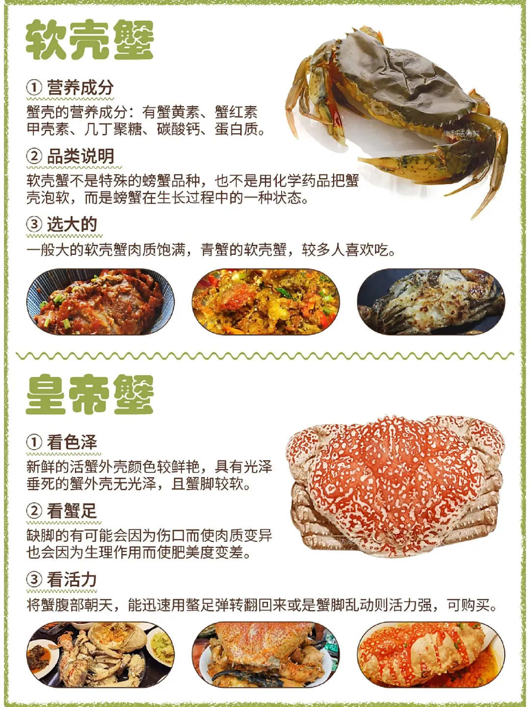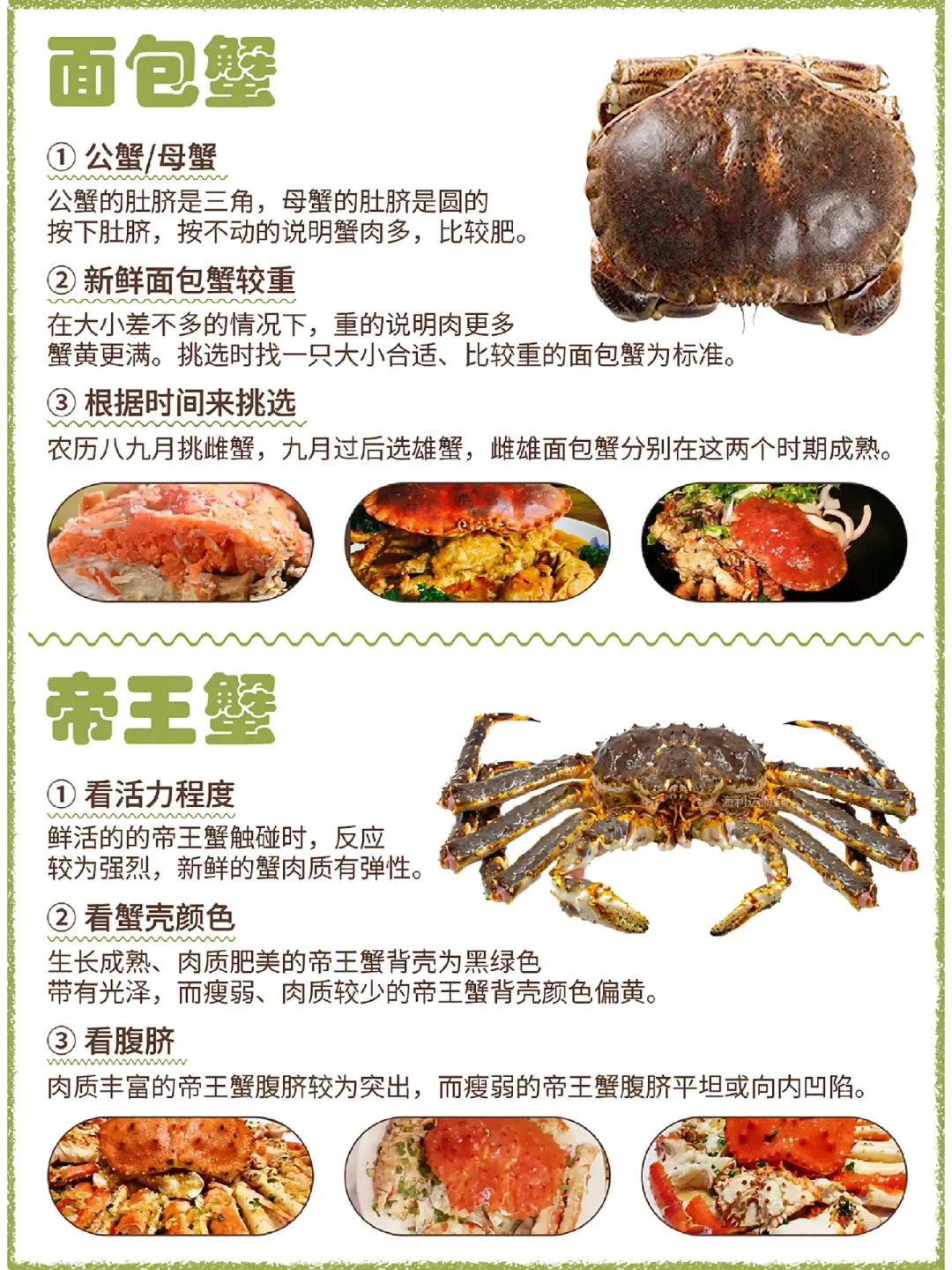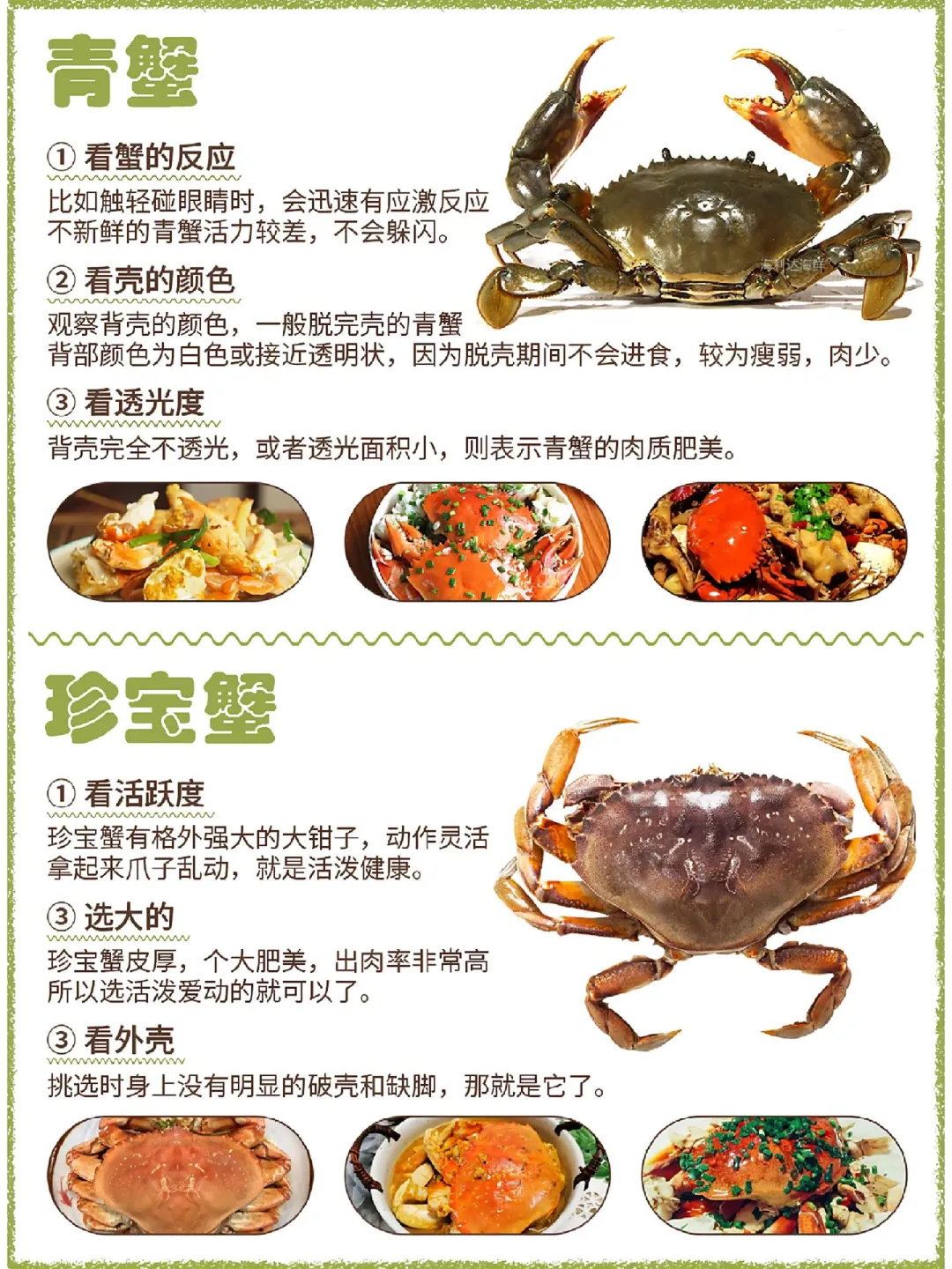 🌟青蟹→碰眼速躲+壳不透光✅ 🌟珍宝蟹→大钳乱舞+壳完整💪 🌸兰花蟹→母蟹半圆肚+轻捏硬实🌼 🌺红花蟹→花纹艳+腿根硬=新鲜! 🦀大闸蟹→肚脐鼓+壳亮毛密=爆膏💛 🔥赤甲红→钳子磨损多=肉紧实! 🍞面包蟹→母圆肚按不动⚖️重者胜 👑帝王蟹→壳黑绿+腹脐凸=肉山! 🌀梭子蟹→青壳白腹+手感沉🚨 🐯老虎蟹→红亮厚身+6月甜到炸🍯 📌口诀: ❌壳软脚蔫=快逃! ✅活力满分+死沉=闭眼冲! 收藏⭐️菜场秒变海鲜行家~