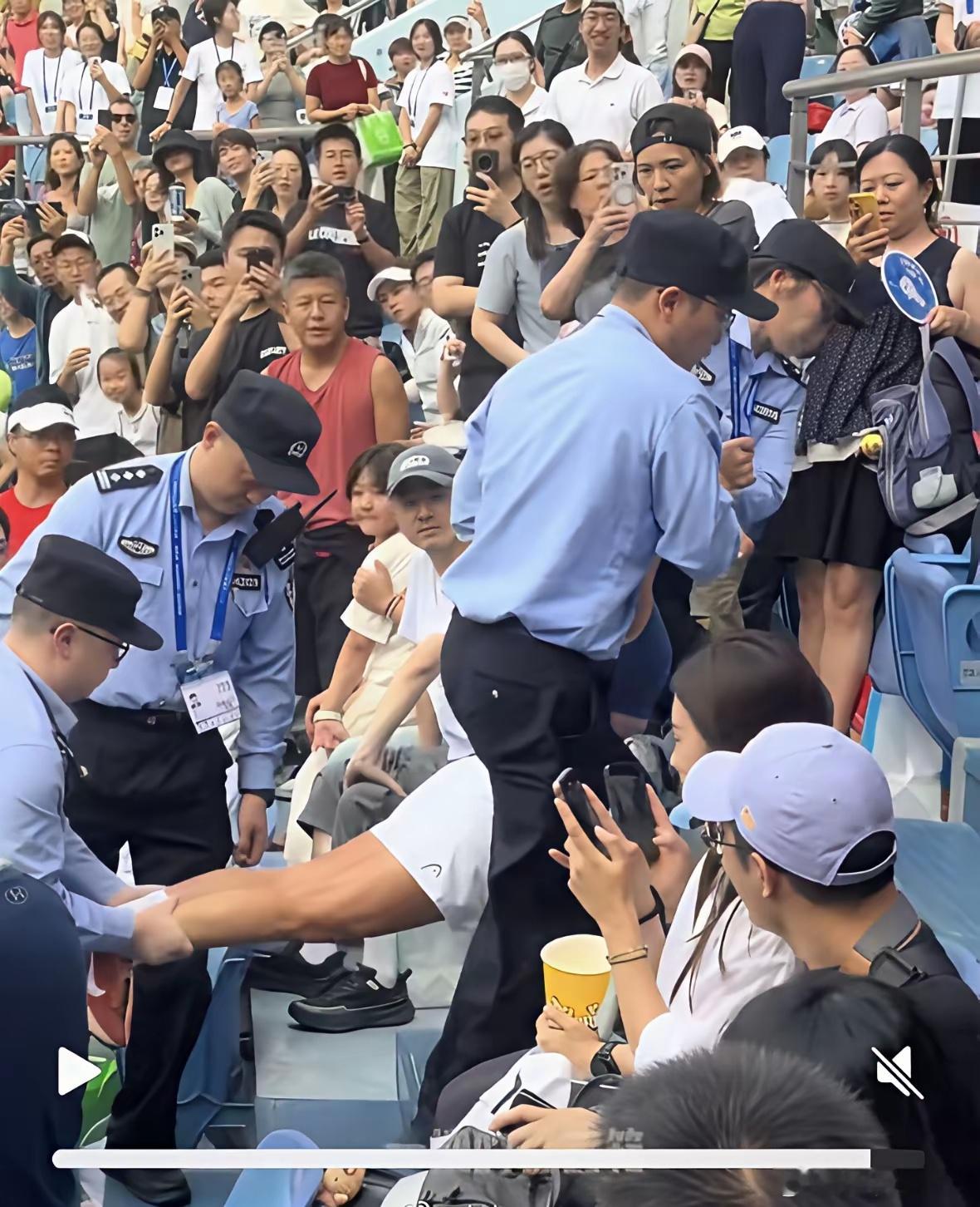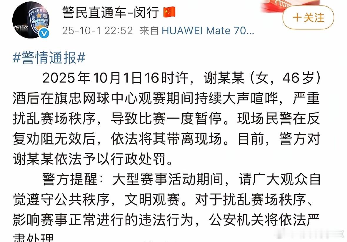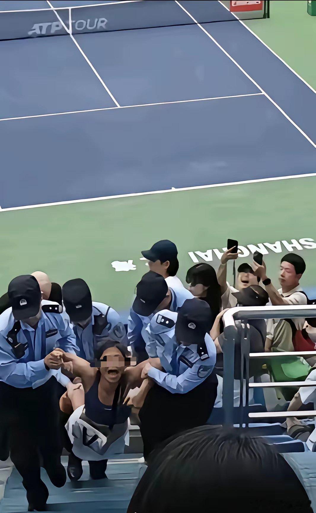 国庆假期第一天,上海旗忠网球中心中央球场,在一场网球比赛中,有名女观众在观众席影响比赛,被多次警告后依然我行我素,最终被安保人员抬出场地。上海闵行区警方官微已经通报批评,并呼吁观众文明观赛。国庆假期第一天,就见识了物种的多样性,这位女士还是带了孩子来观赛的,真不知道是怎么想的?