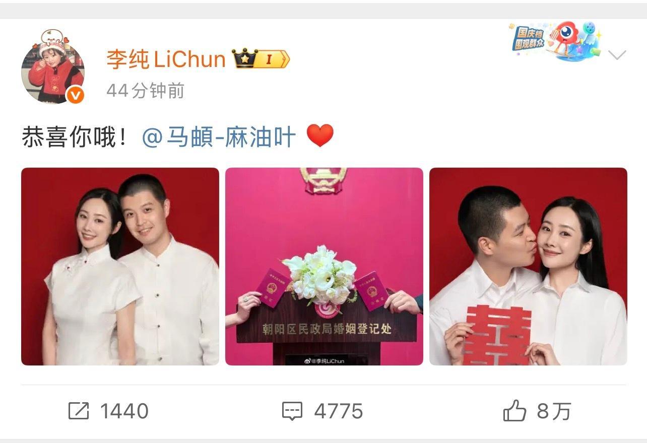 李纯马頔结婚恭喜马頔李纯在国庆假期第二天领证结婚[打call][打call][打call]九月金玉妍封后,十月魏嬿婉结婚,大家都有幸福的未来[心][心][心]